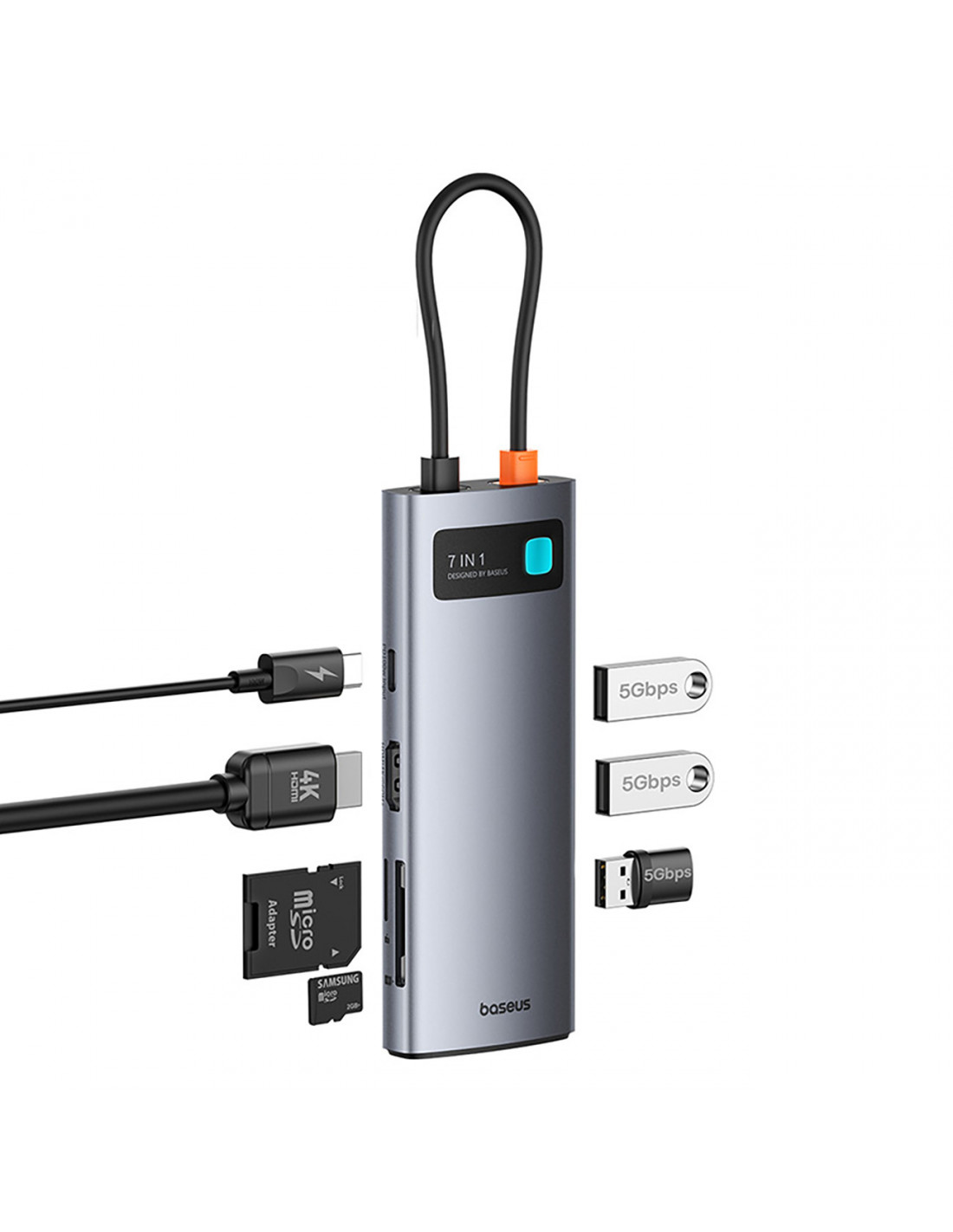 Išplėskite savo nešiojamojo kompiuterio, planšetinio kompiuterio ar žaidimų konsolės galimybes su „Baseus Metal Gleam 7-in-1“ – daugiafunkciu USB-C šakotuvu , kuris sujungia kompaktišką dizainą su pažangiomis funkcijomis. HDMI prievadas palaiko 4K vaizdo įrašą 60 Hz dažniu, todėl galima stebėti neįtikėtinai sklandžius ir detalius pristatymus bei žaidimus. Trys USB 3.0 prievadai užtikrina žaibišką duomenų perdavimą, o SD ir „microSD“ kortelių skaitytuvai suteikia greitą prieigą prie nuotraukų ir turinio. Dėl USB-C maitinimo (PD) prievado, kurio įvesties galia yra iki 100 W, o išvesties – 85 W, galite vienu metu įkrauti nešiojamąjį kompiuterį ir naudoti priedus. Visa tai telpa elegantiškame aliuminio korpuse su BCT aušinimo technologija, kuri garantuoja stabilumą net ir intensyviai naudojant.