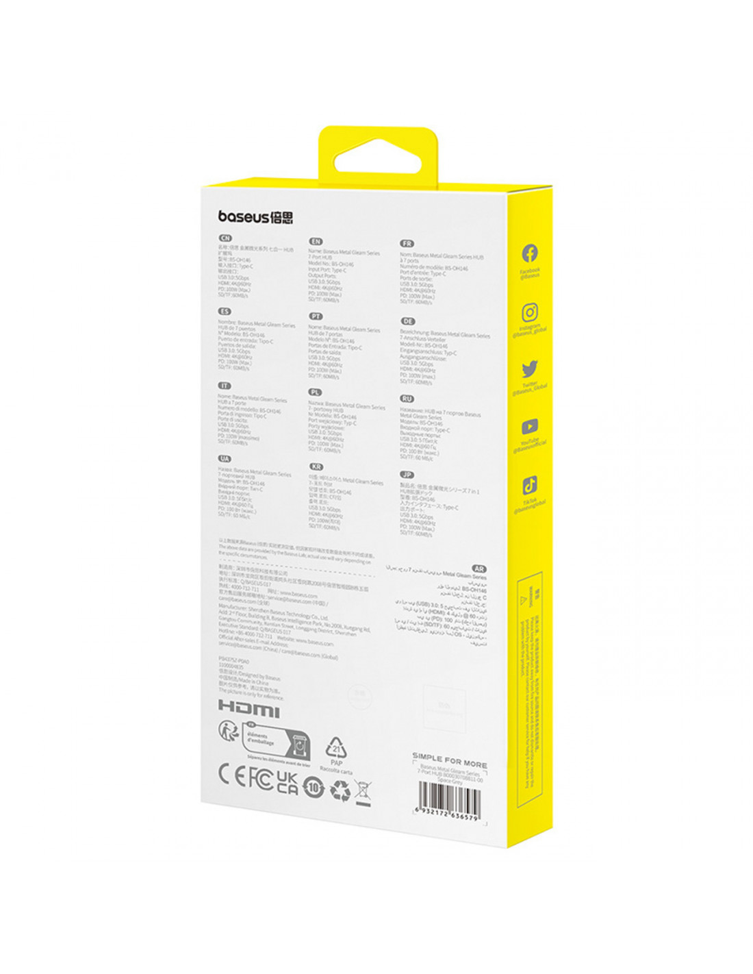 Išplėskite savo nešiojamojo kompiuterio, planšetinio kompiuterio ar žaidimų konsolės galimybes su „Baseus Metal Gleam 7-in-1“ – daugiafunkciu USB-C šakotuvu , kuris sujungia kompaktišką dizainą su pažangiomis funkcijomis. HDMI prievadas palaiko 4K vaizdo įrašą 60 Hz dažniu, todėl galima stebėti neįtikėtinai sklandžius ir detalius pristatymus bei žaidimus. Trys USB 3.0 prievadai užtikrina žaibišką duomenų perdavimą, o SD ir „microSD“ kortelių skaitytuvai suteikia greitą prieigą prie nuotraukų ir turinio. Dėl USB-C maitinimo (PD) prievado, kurio įvesties galia yra iki 100 W, o išvesties – 85 W, galite vienu metu įkrauti nešiojamąjį kompiuterį ir naudoti priedus. Visa tai telpa elegantiškame aliuminio korpuse su BCT aušinimo technologija, kuri garantuoja stabilumą net ir intensyviai naudojant.