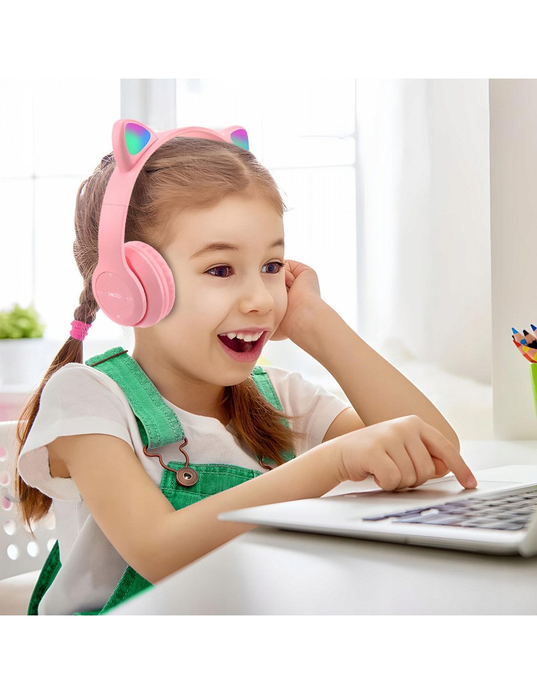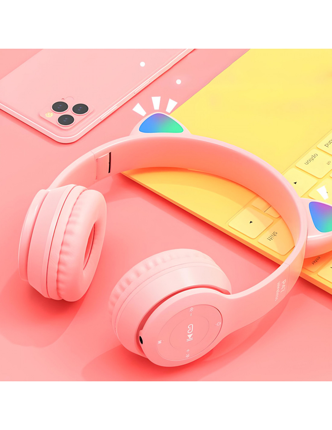 Belaidės ausinės vaikams su FM „Bluetooth“ šviečiančiu LED SD katinu - rožinės spalvos