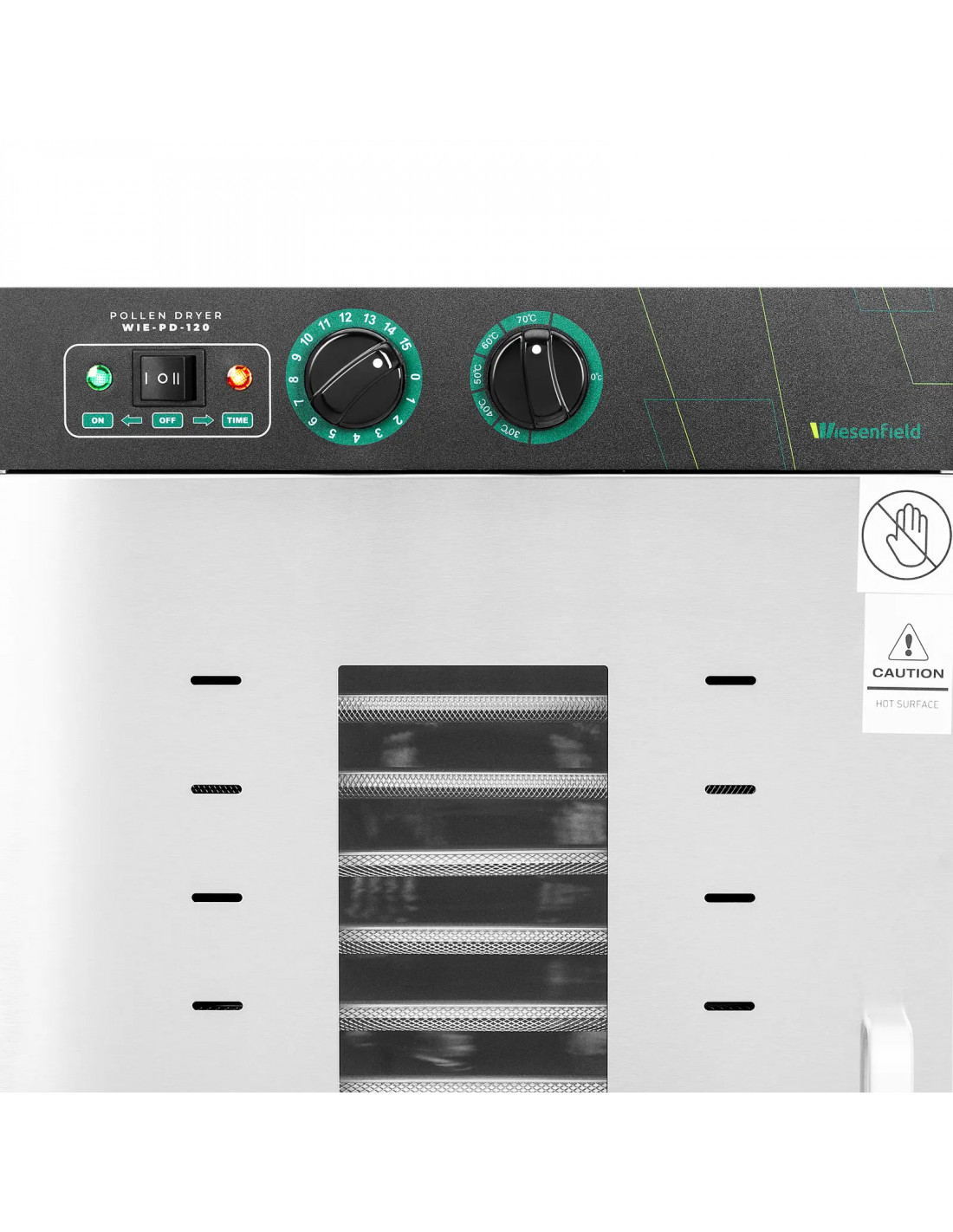 „Wiesenfield“ bičių žiedadulkių džiovintuvas yra efektyvus sprendimas bičių surinktoms žiedadulkėms džiovinti. Dviejų kamerų bendras tūris yra 216 litrų, todėl drėgmę galima pašalinti iš didelio žiedadulkių kiekio vienu metu. Efektyvi 3150 W kaitinimo galia užtikrina, kad prietaisas greitai pasiektų norimą temperatūrą ir kaskart užtikrintų nuoseklius rezultatus. Laikmatis leidžia nustatyti džiovinimo laiką kiekvienoje kameroje nuo 0 iki 15 valandų . Šis efektyvus džiovintuvas užtikrina optimalų dviejų kamerų džiovinimą ir padalijimą. Šis elektrinis žiedadulkių džiovintuvas yra labai tikslus dėl galimybės pasirinkti darbinę temperatūrą nuo 30 iki 70 °C ir trijų greičių ventiliatoriaus valdymo. Temperatūrą ir ventiliatoriaus greitį galima reguliuoti atskirai abiejose kamerose. 32 lentynos leidžia efektyviai padalyti kameras, suteikiant pakankamai vietos dideliam bičių žiedadulkių kiekiui. Grotelės pagamintos iš nerūdijančio plieno, kurį lengva valyti. Pridedamos džiovinimo skardos, kad žiedadulkės nesuliptų. Patvarus nerūdijančio plieno korpusas ir grūdinto stiklo langai garantuoja aukštą patikimumą ir ilgą tarnavimo laiką. Langai suteikia aiškų džiovinimo proceso vaizdą. Dėl vos 55 dB triukšmo lygio žiedadulkių džiovintuvas netrukdys atlikti kitų užduočių net tylioje aplinkoje. Keturi ratukai leidžia lengvai pastatyti žiedadulkių džiovintuvą bet kur.