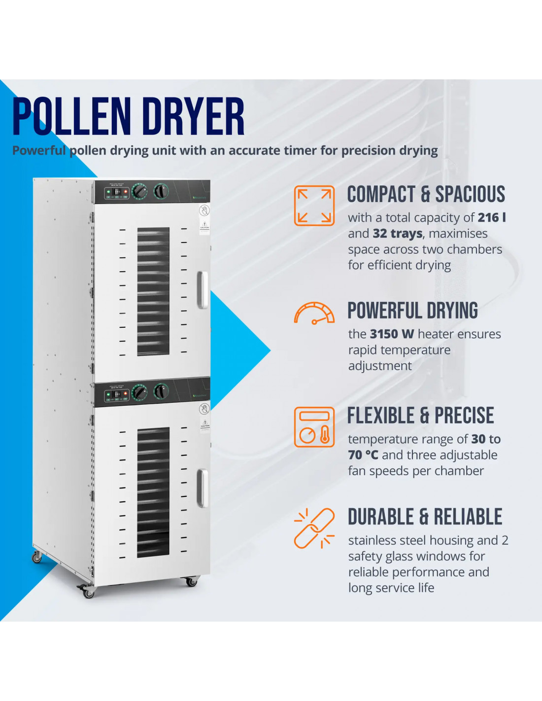 - - Bičių žiedadulkių džiovintuvas, kurio bendra talpa yra 216 l ir yra 32 lentynos, optimaliai išnaudos erdvę dviejose kamerose ir suteiks pakankamai vietos džiovinimui,