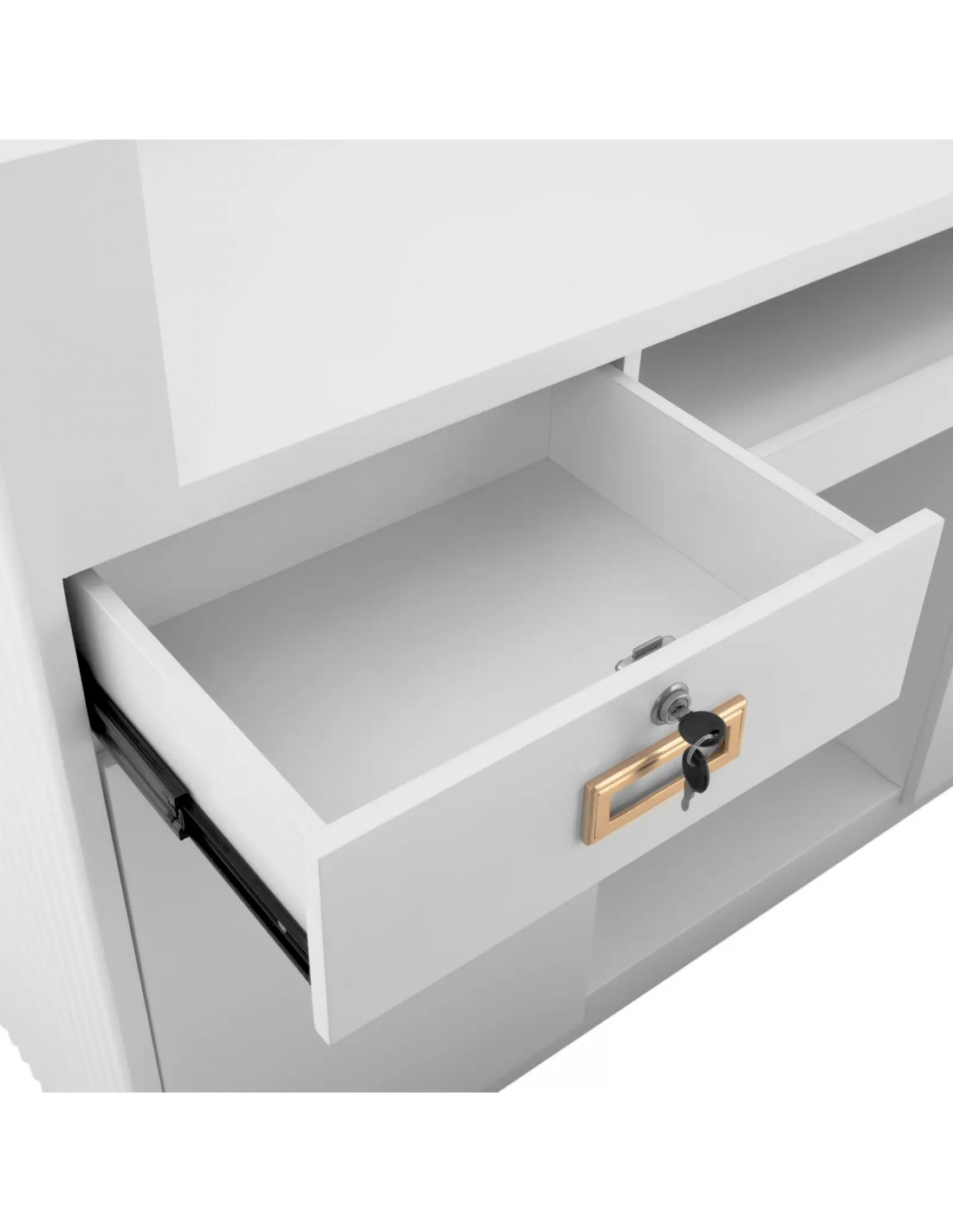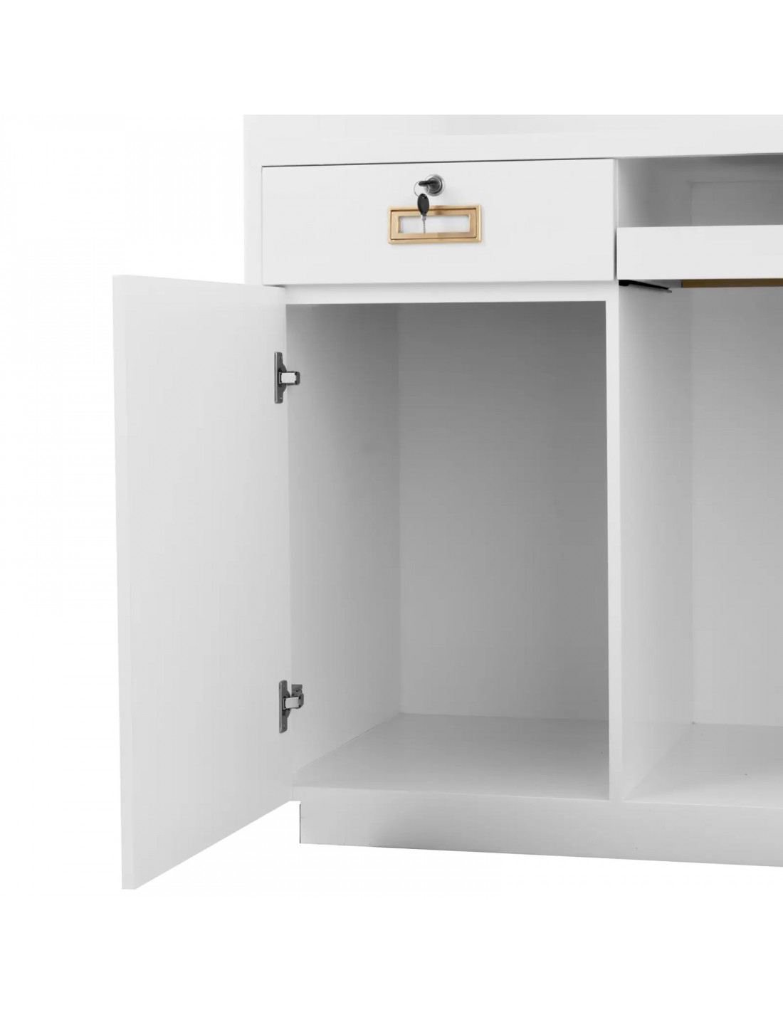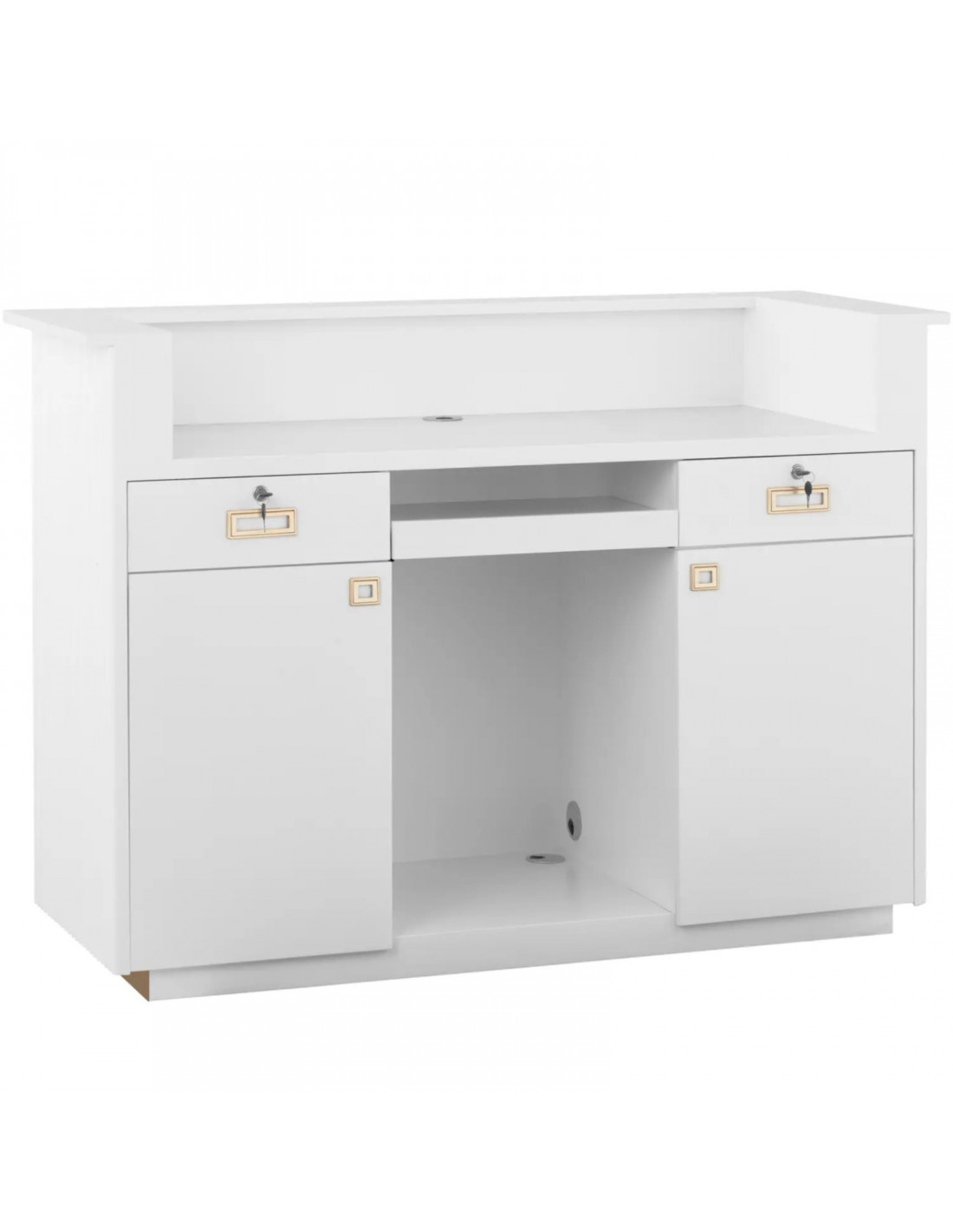 „Physa“ registratūros stalas puikiai tinka biurams, viešbučiams, medicinos praktikoms ir grožio salonams. Jis išskirtinai elegantiškas ir akį traukiantis. Jis harmoningai dera prie jūsų interjero ir pabrėžia jūsų įmonės profesionalų charakterį. Stalas turi daug skyrių ir stalčių, kuriuose yra daug vietos dokumentams tvarkyti. Kartu su ištraukiama klaviatūros lentyna stalas garantuoja tvarkingą ir profesionalią darbo vietą. Rakinamas registratūros stalas apsaugo vertingus daiktus ir konfidencialius dokumentus nuo neteisėtos prieigos. Stalo patvarumą lemia tvirta plieno ir MDF konstrukcija.