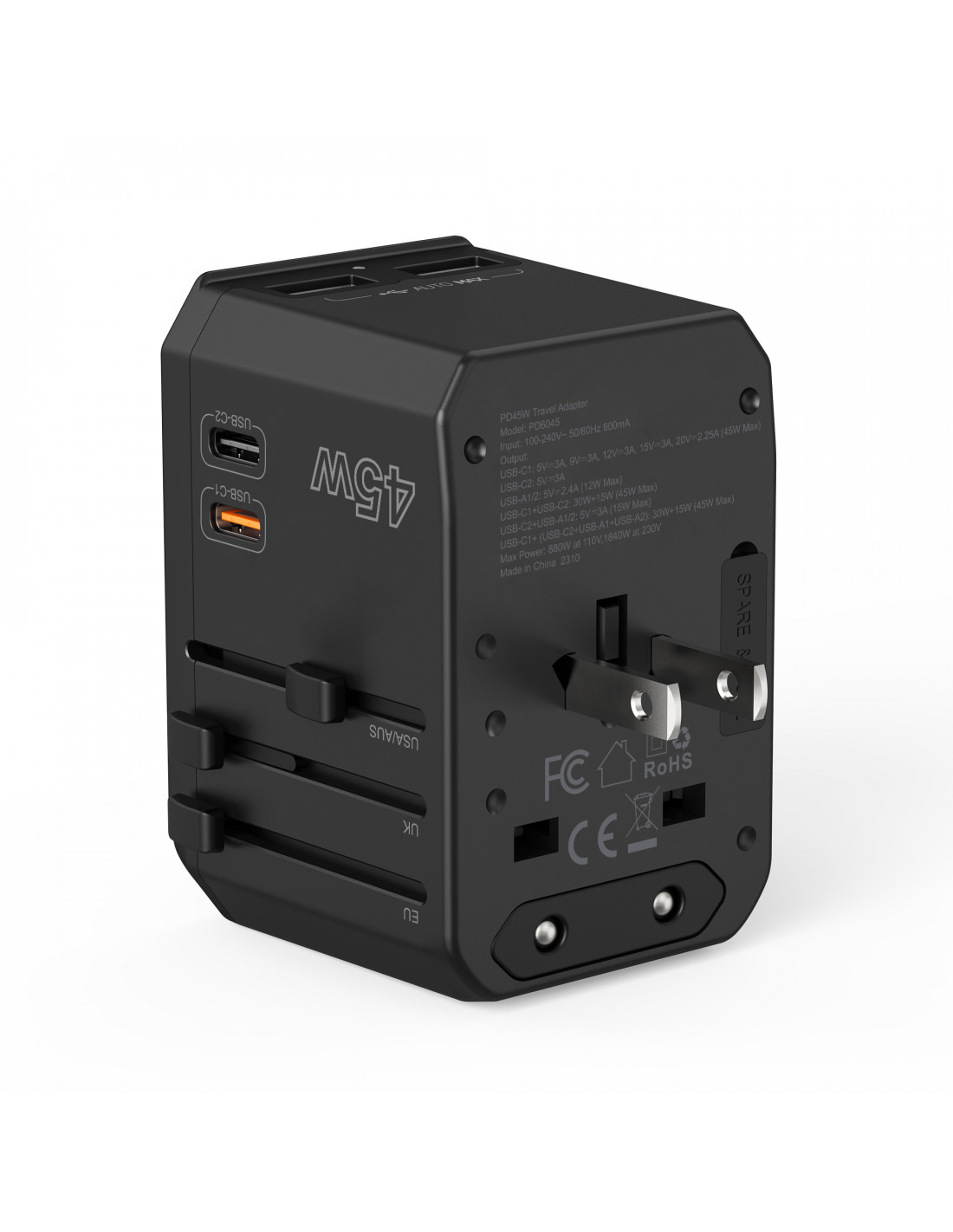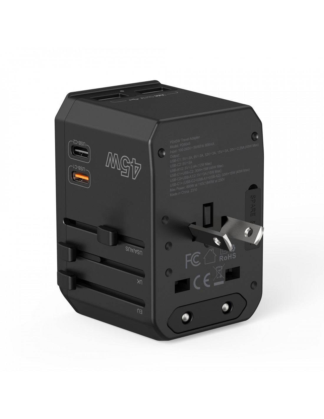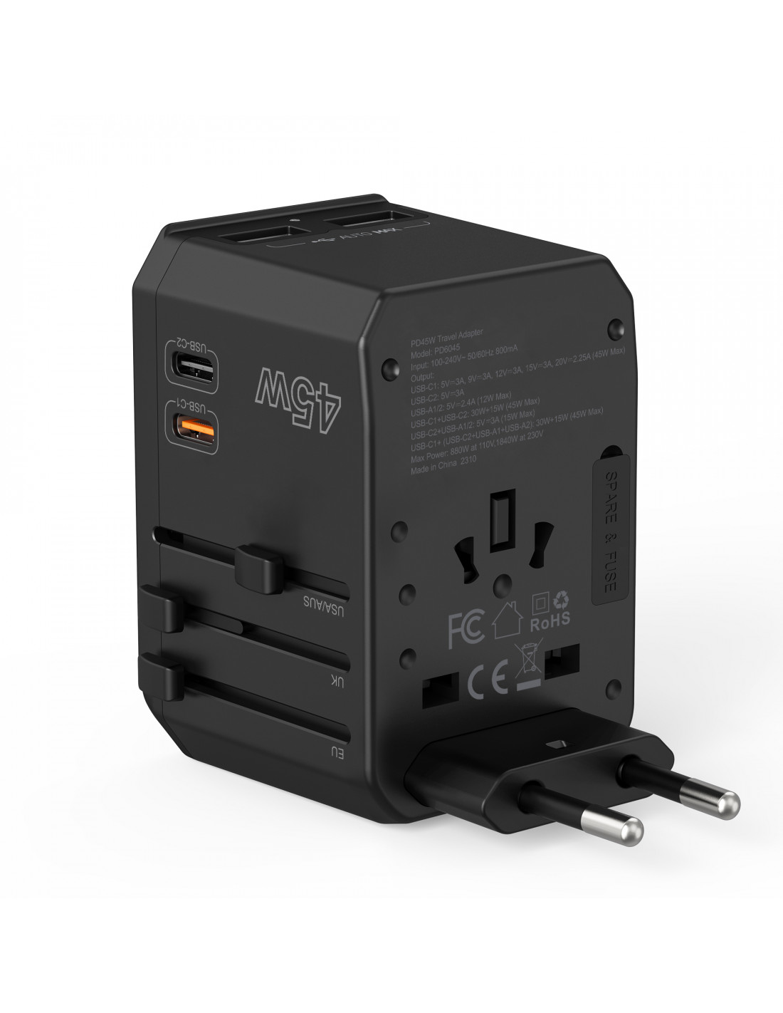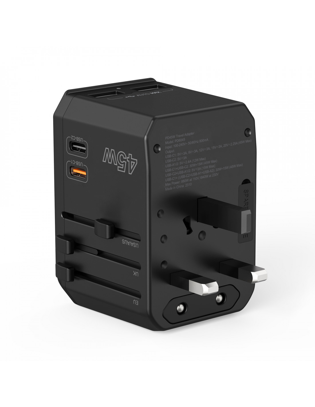 Universalus kelioninis įkroviklis 2x USB-C 2x USB-A PD 45W JAV ES JK AU kištukai juodi