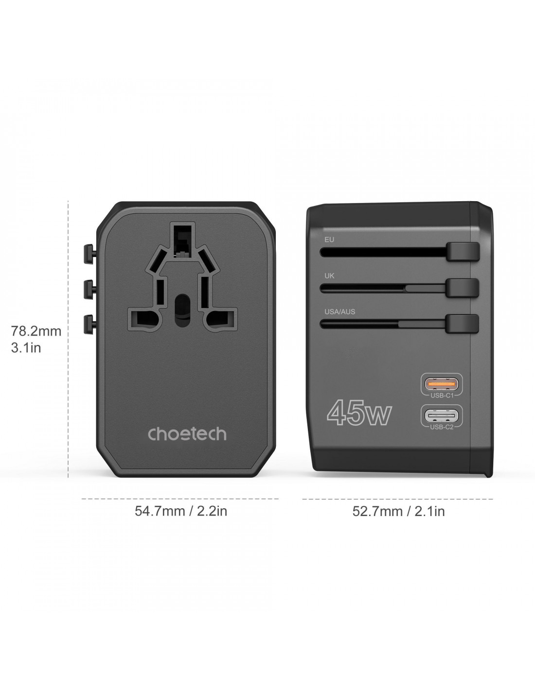 „Choetech PD6045“ sieninis įkroviklis turi du USB-C ir du USB-A prievadus. Jis gali įkrauti keturis įrenginius vienu metu. Jo galia siekia iki 45 W. Jis leidžia modifikuoti kištuką, prisitaikydamas prie JAV, ES, JK ir Australijos standartų. Jame naudojama GaN technologija, todėl nepaisant kompaktiško dydžio, įkrovimas yra greitas ir efektyvus.