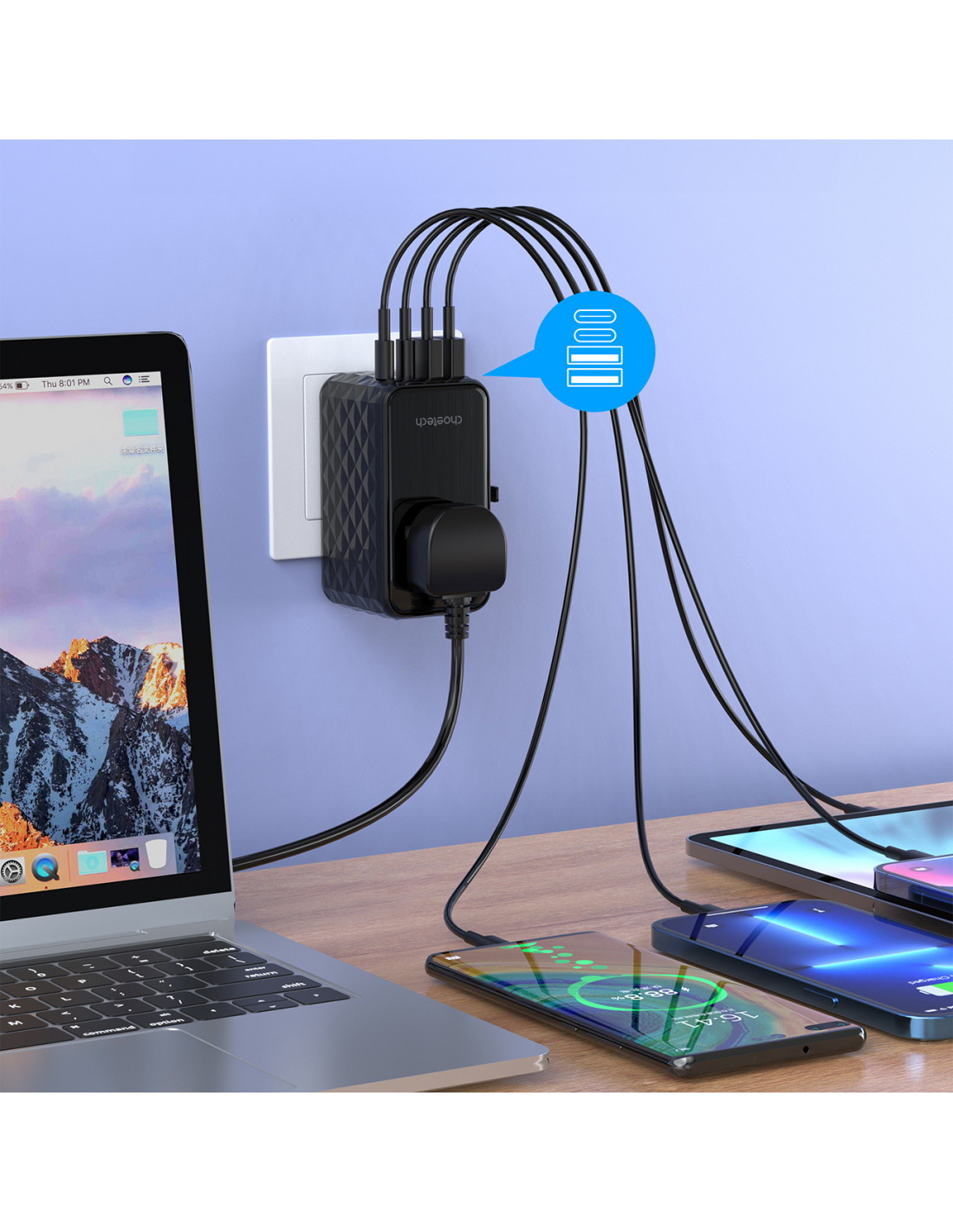 „Choetech PD6028“ adapteris leidžia vienu metu įkrauti iki penkių įrenginių. Adapteris turi du USB-C, du USB-A prievadus ir vieną kintamosios srovės lizdą, todėl patenkins net reikliausių vartotojų poreikius. Greitas įkrovimas įmanomas dėl tokių technologijų kaip „Power Delivery“ ir „Quick Charge 3.0“ palaikymo, o tai reiškia, kad jūsų įrenginiai bus paruošti naudoti akimirksniu.
