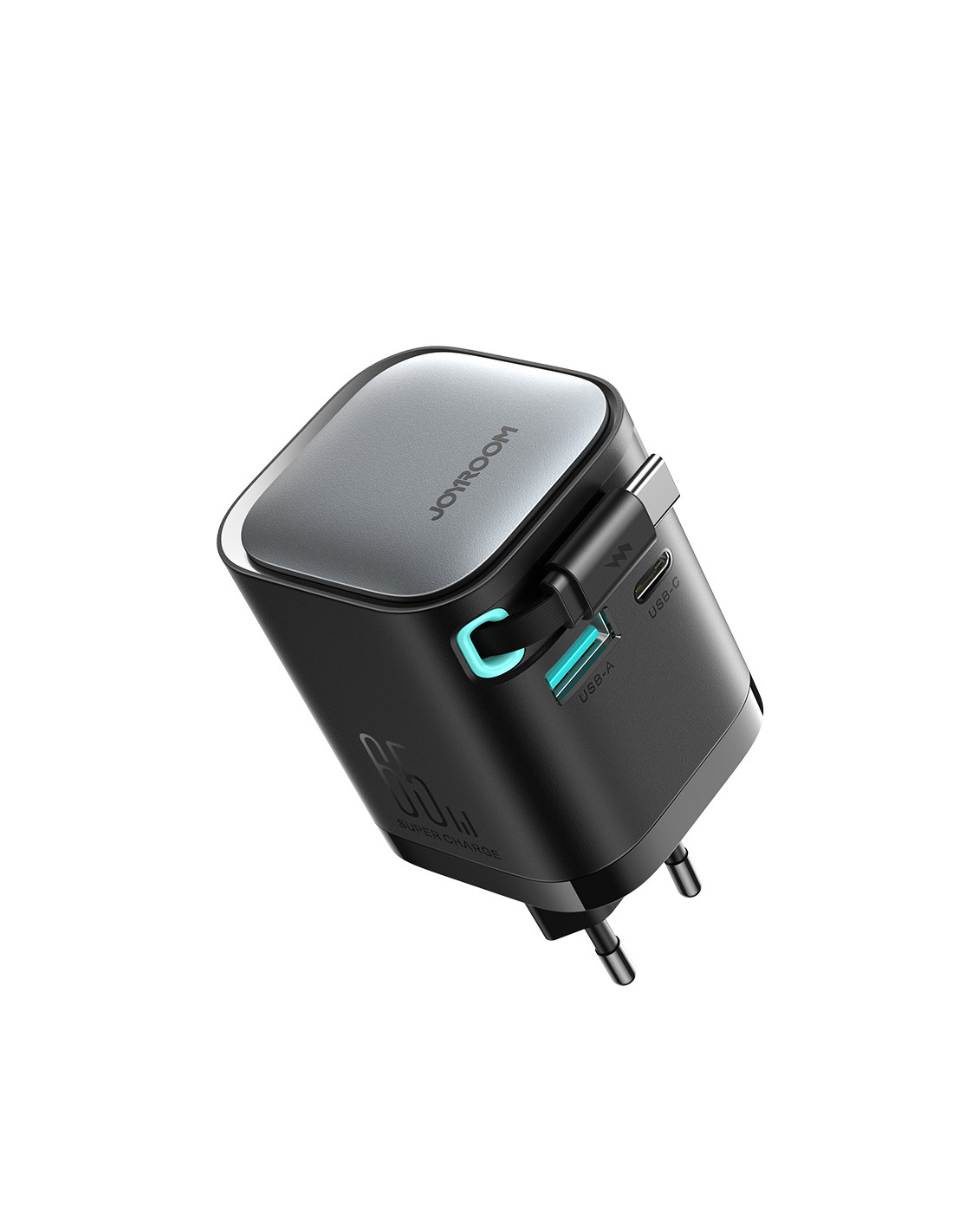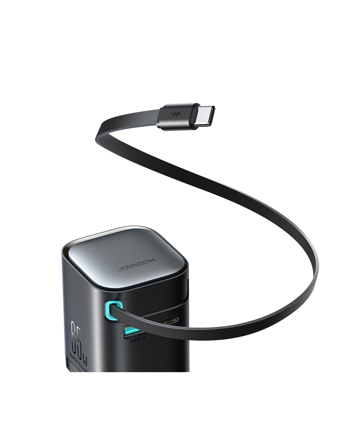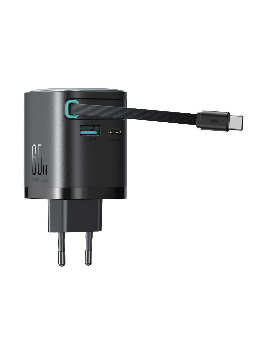 „GaN“ 65 W USB-A USB-C sieninis įkroviklis su integruotu USB-C laidu – juodas