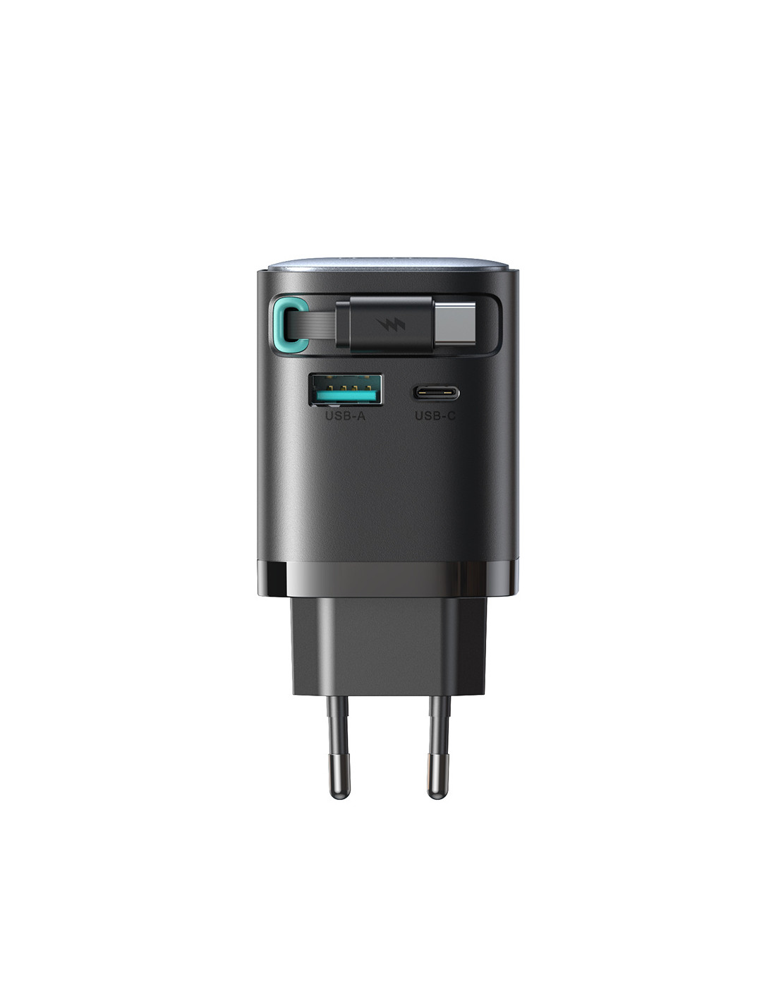 - - GaN 65W USB-A USB-C sieninis įkroviklis su integruotu USB-C laidu - juodas