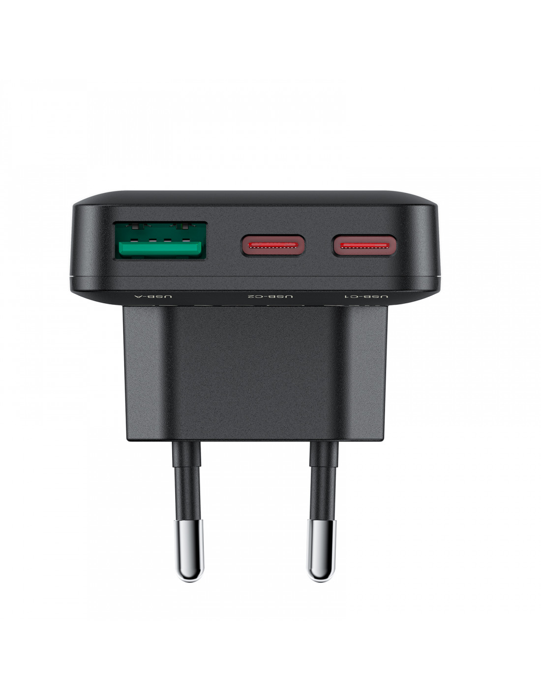 - - Trys įkrovimo prievadai – du USB-C ir vienas USB-A prievadas leidžia vienu metu įkrauti tris įrenginius, todėl šis įkroviklis yra itin praktiškas sprendimas bet kokioje aplinkoje.