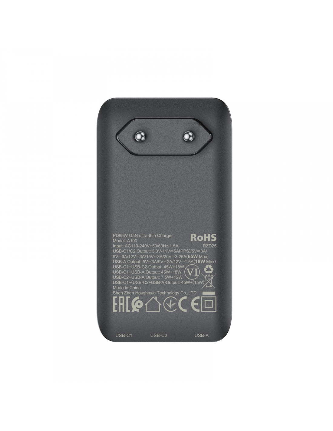 - USB-C1/C2 – 3,3 V – 11 V – 5 A (PPS), 5 V / 9 V / 12 V / 15 V – 3 A, 20 V – 3,25 A (maks. 65 W)