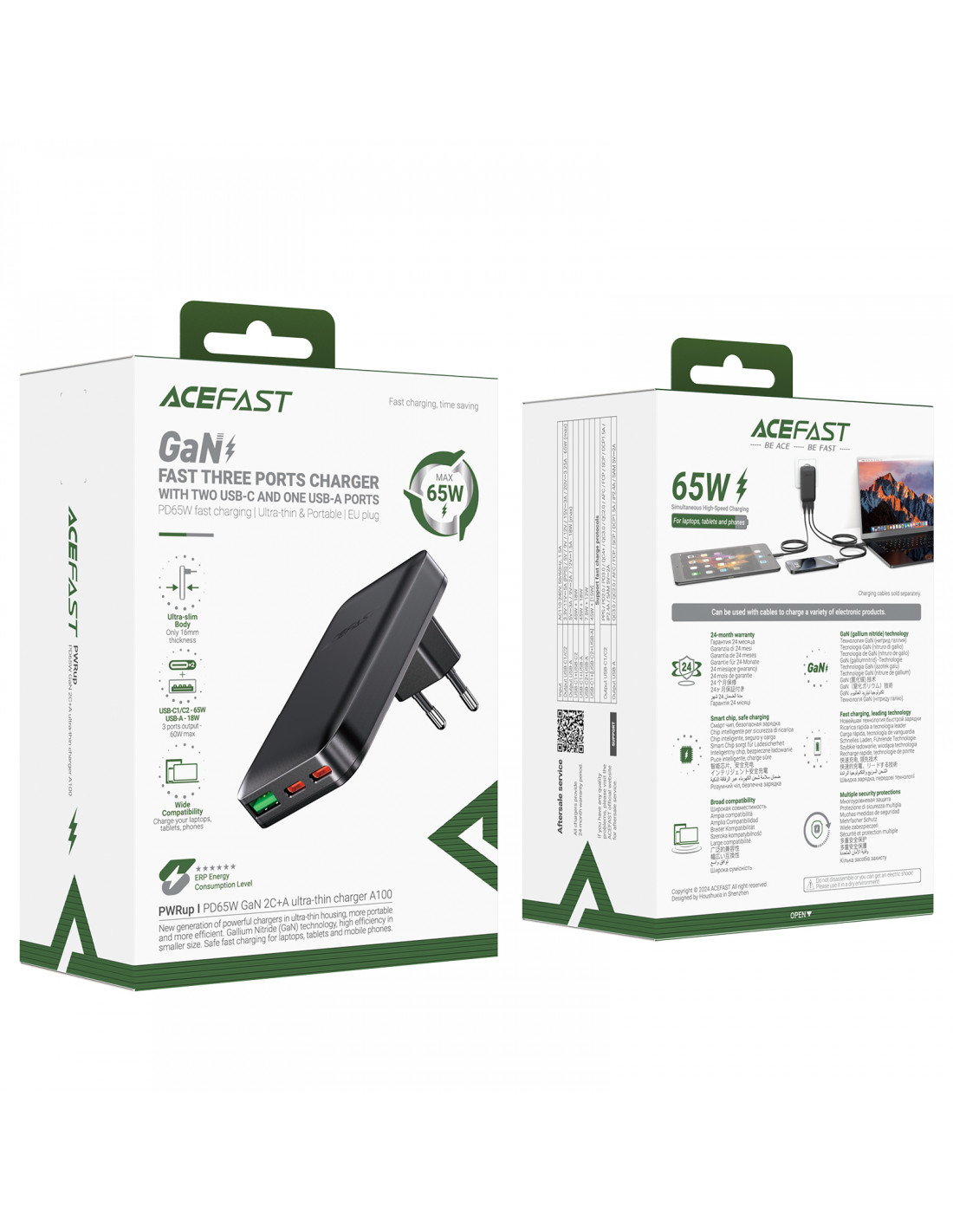 65 W galios „Acefast A100“ įkroviklis leidžia greitai įkrauti įvairius įrenginius – nuo nešiojamųjų kompiuterių iki išmaniųjų telefonų, todėl tai puikus pasirinkimas tiems, kuriems reikia efektyvaus maitinimo šaltinio.