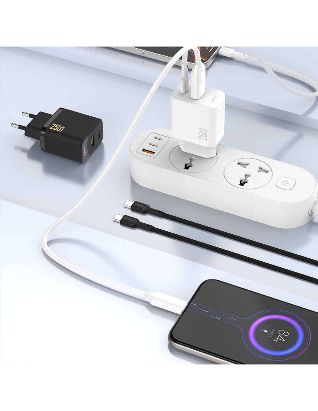GaN technologijos naudojimas užtikrina aukštą įkrovimo efektyvumą ir minimalų įrenginio šilumos generavimą. Tai idealus sprendimas greitam išmaniųjų telefonų ir planšetinių kompiuterių įkrovimui.