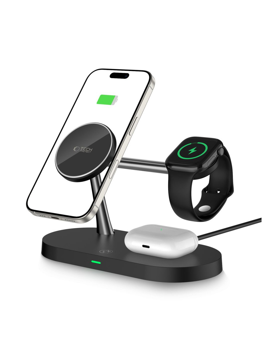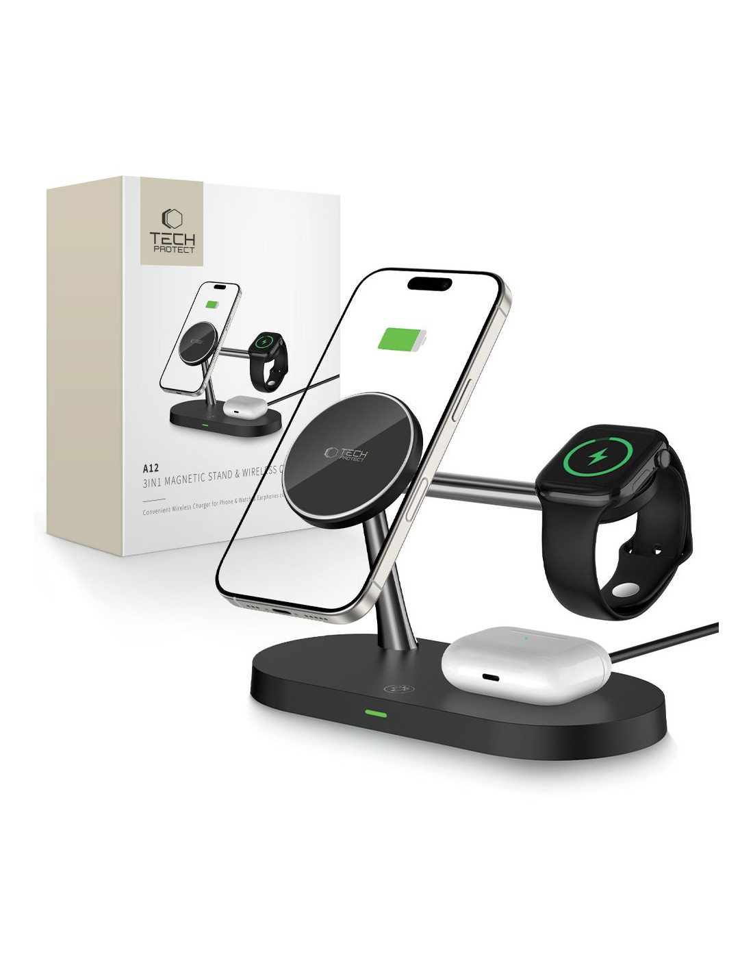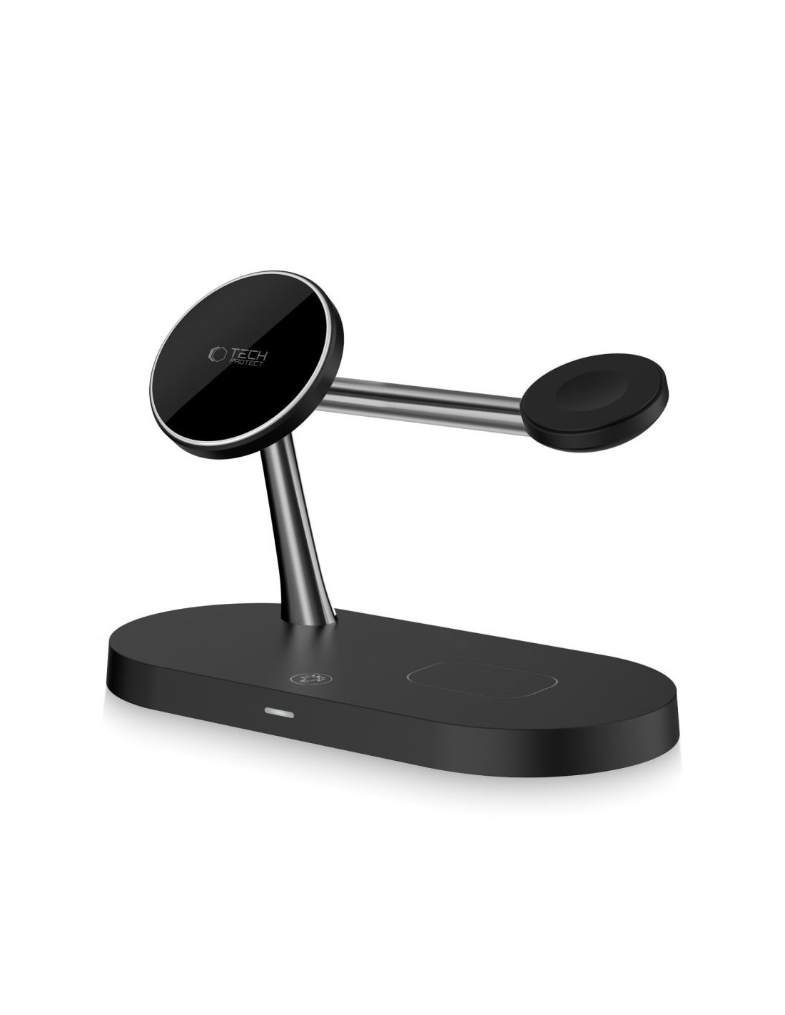Daugiafunkcis „Tech-Protect“ indukcinis įkroviklis leidžia vienu metu arba atskirai įkrauti tris įrenginius – „iPhone“ su „MagSafe“, „AirPods“ ir „Apple Watch“. Paprastas, bet funkcionalus dizainas su matiniu paviršiumi suteikia jam labai estetišką išvaizdą. Įkroviklis taip pat turi LED lemputę, valdomą jutikliniu mygtuku. Modulinė konstrukcija leidžia įkrauti įrenginius įvairiomis konfigūracijomis. Magnetas tvirtai laiko viską, o viskas stovi ant tvirtų, neslystančių guminių kojelių. Apsaugos sistema apsaugo prijungtus įrenginius nuo perkaitimo ir viršįtampio, įkrovimo metu palaikydama pastovią žemą temperatūrą. Todėl net palikti įrenginius ant įkroviklio kelias valandas yra visiškai saugu.