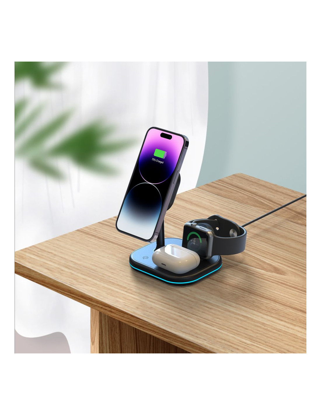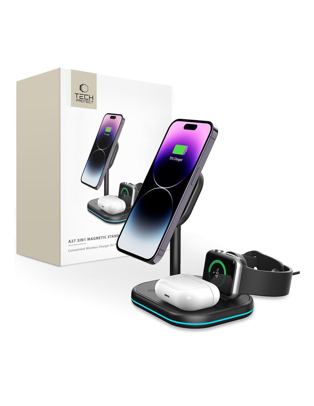 „Tech-Protect QI15W-A27 3 viename“ įkroviklis yra universalus įrenginys, leidžiantis vienu metu įkrauti tris skirtingus įrenginius. Dėl „MagSafe“ technologijos galite įkrauti suderinamą išmanųjį telefoną be laido. „A27“ gali įkrauti ne tik telefoną, bet ir „Apple Watch“. Tiesiog padėkite jį ant specialiai sukurto stovo ir belaidžiu būdu prijunkite, kad įkrautumėte laikrodžio bateriją. Be to, įrenginys palaiko belaidžio įkrovimo ausines, tokias kaip „Apple AirPods“ ar „Samsung Galaxy Buds“. Tiesiog padėkite dėklą ant įkroviklio paviršiaus, ir įkrovimo procesas prasidės automatiškai. Kita praktiška savybė – įmontuotas LED apšvietimas . Jis suteikia subtilų apšvietimą, kuris leidžia lengviau rasti priedą tamsoje. „A27“ ne tik leidžia įkrauti tris įrenginius vienu metu, bet ir turi funkciją , leidžiančią įkrauti kiekvieną įrenginį atskirai. Tai suteikia jums visišką kiekvieno įrenginio įkrovimo kontrolę, leidžiančią optimizuoti įkrovimo laiką. Integruota saugos sistema apsaugo jūsų įrenginius nuo perkaitimo, trumpojo jungimo ir kitų galimų įkrovimo pavojų. Naudodami šį įkroviklį, galite būti tikri, kad jūsų įrenginiai yra saugūs.