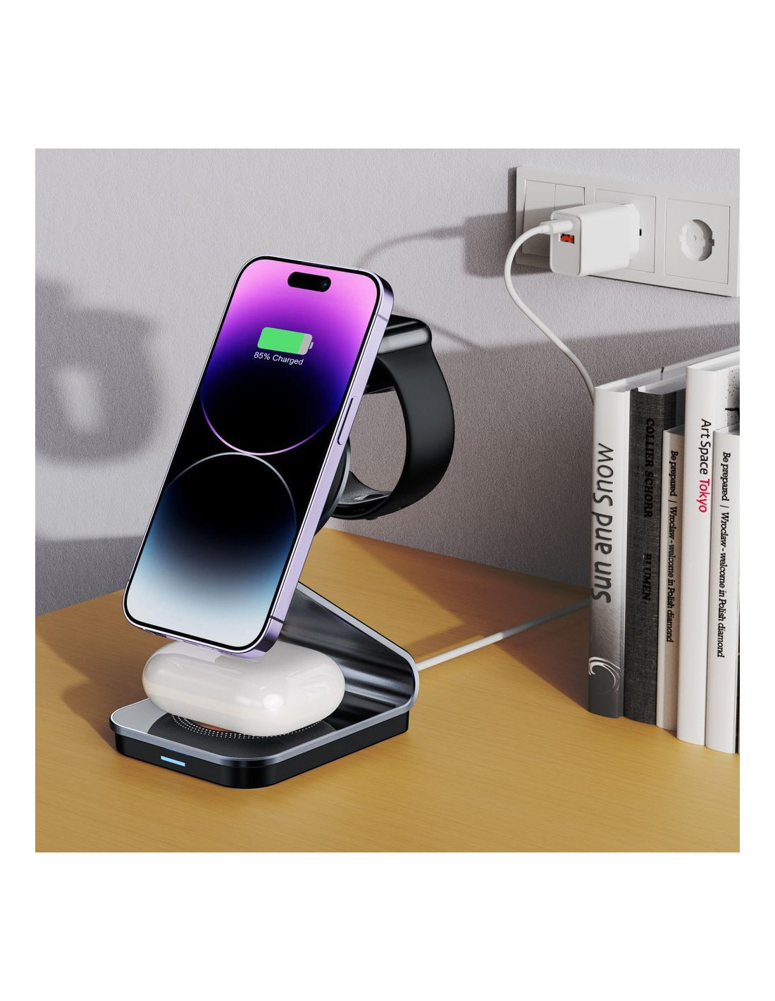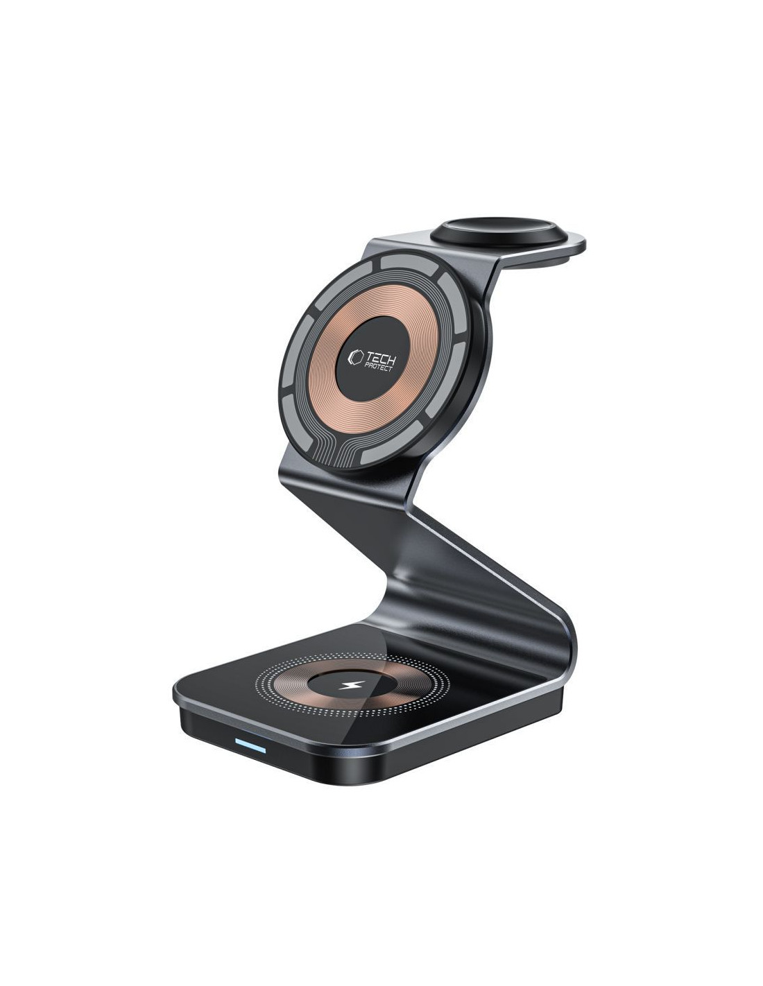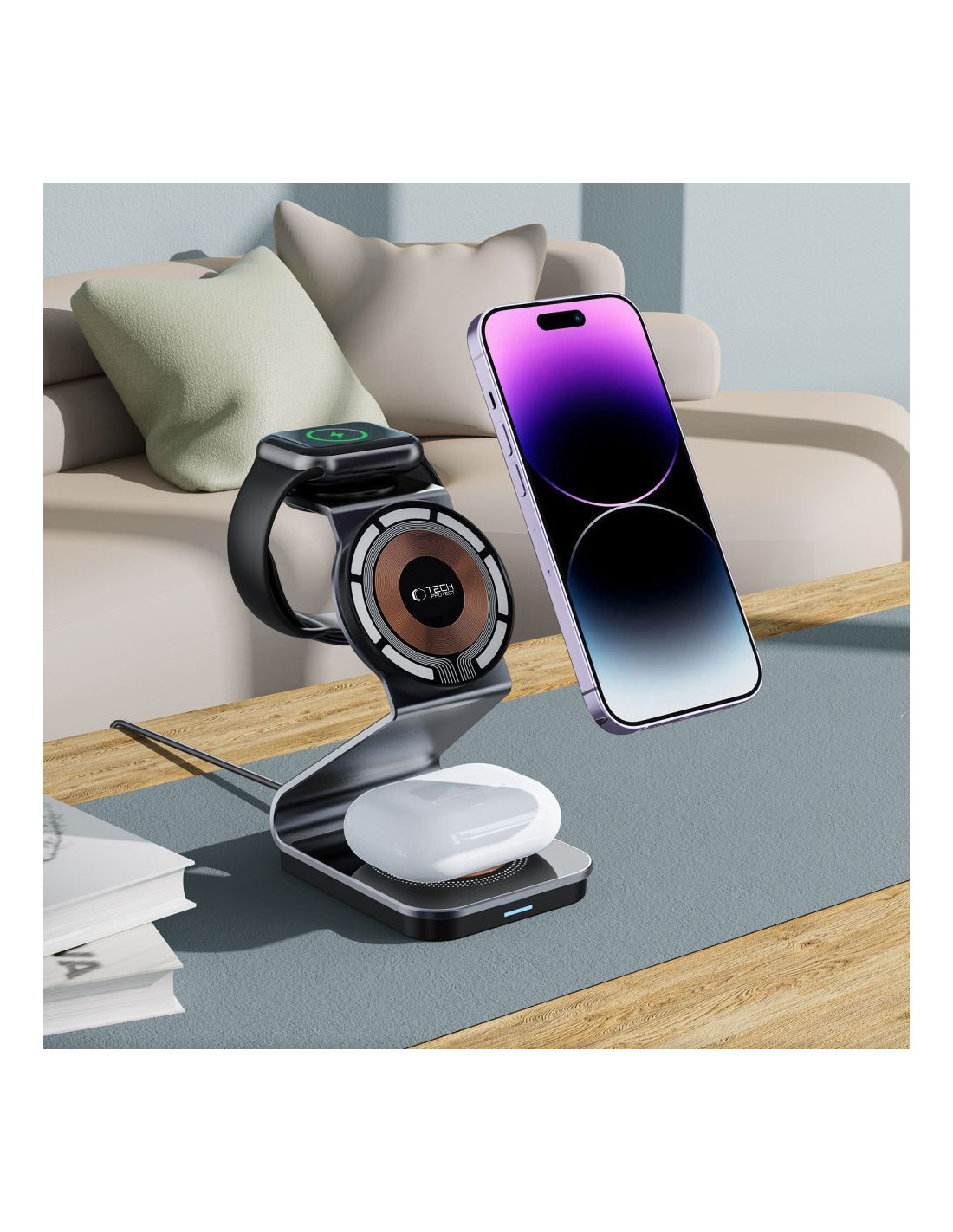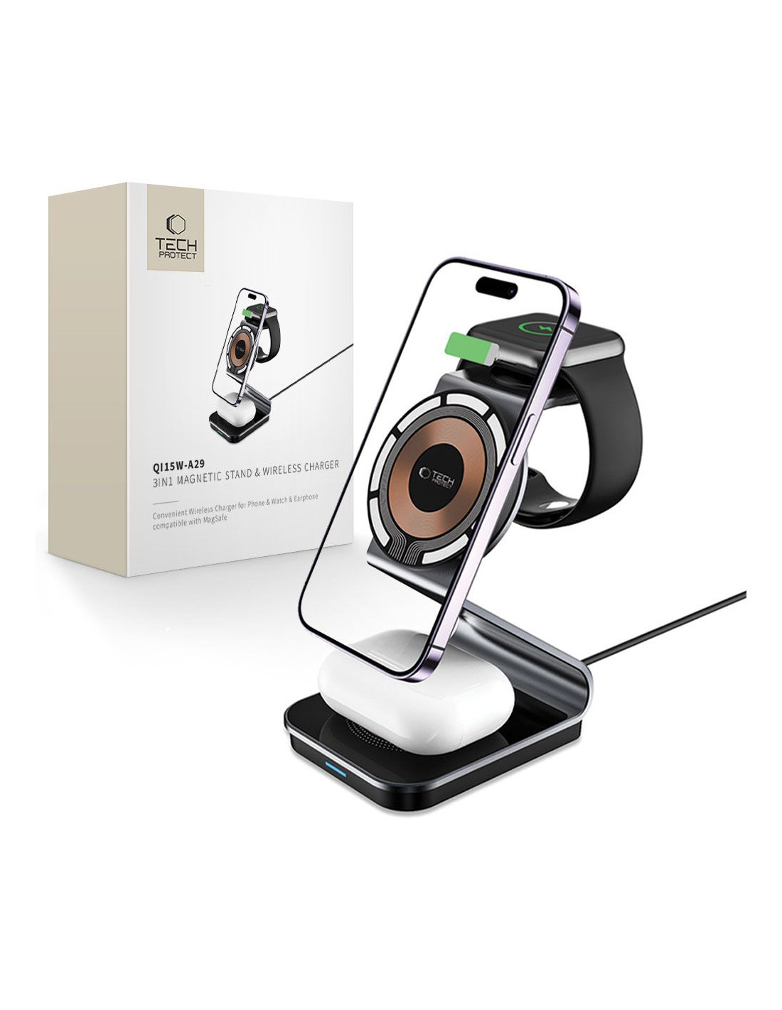 „Tech-Protect QI15W-A29“ yra universalus 3 viename įkroviklis , pasižymintis daugybe funkcijų ir paprastu naudojimu. Vienas iš pagrindinių jo privalumų – galimybė vienu metu įkrauti iki trijų įrenginių. Tai reiškia, kad jums nebereikia jaudintis dėl „MagSafe“ išmaniojo telefono, „Apple Watch“ ar belaidžių ausinių, tokių kaip „Apple AirPods“ ar „Samsung Galaxy Buds“, išsikrovimo. Kiekvienas iš šių įrenginių turi atskirą įkrovimo prievadą, užtikrinantį nepertraukiamą ir efektyvų įkrovimą. Tačiau „Tech-Protect QI15W-A29“ yra ne tik praktiškas, bet ir elegantiškas. Jo modernus dizainas puikiai dera su įvairiais interjerais ir stiliais, suteikdamas jam rafinuotumo. Pagamintas iš aukščiausios kokybės medžiagų, įkroviklis ne tik atrodo įspūdingai, bet ir užtikrina tvirtą bei patvarią konstrukciją, užtikrinančią ilgalaikį naudojimą. Saugumas yra „QI15W-A29“ prioritetas. Fone veikia įmontuota apsaugos sistema , stebinti įkrovimo procesą ir užkertanti kelią galimoms grėsmėms. Tai reiškia, kad jums nereikia jaudintis dėl perkaitimo, viršįtampio ar trumpojo jungimo, kurie galėtų pakenkti jūsų vertingiems įrenginiams. Tai ne tik pailgina baterijos veikimo laiką, bet ir leidžia mėgautis ramybe naudojant įkroviklį.