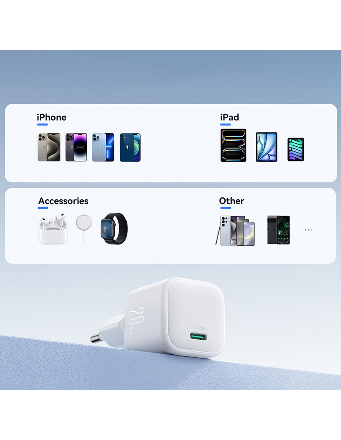- - Kompaktiškas dydis : įkroviklis yra 35 % mažesnis nei tradiciniai 20 W įkrovikliai, todėl jį itin patogu ir lengva laikyti.