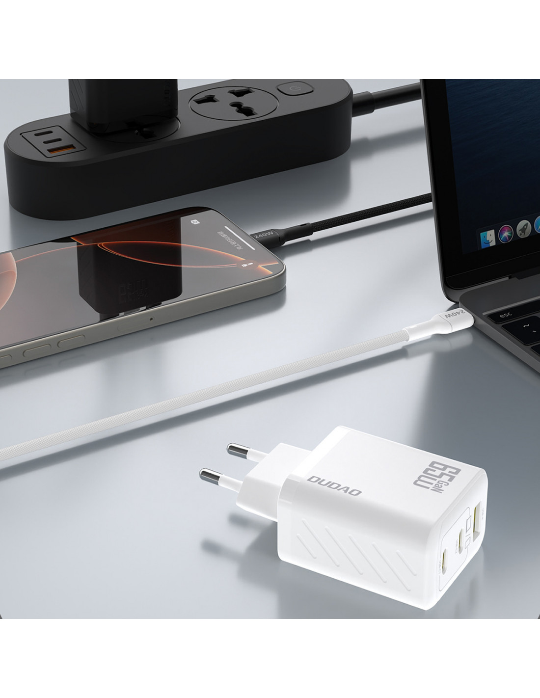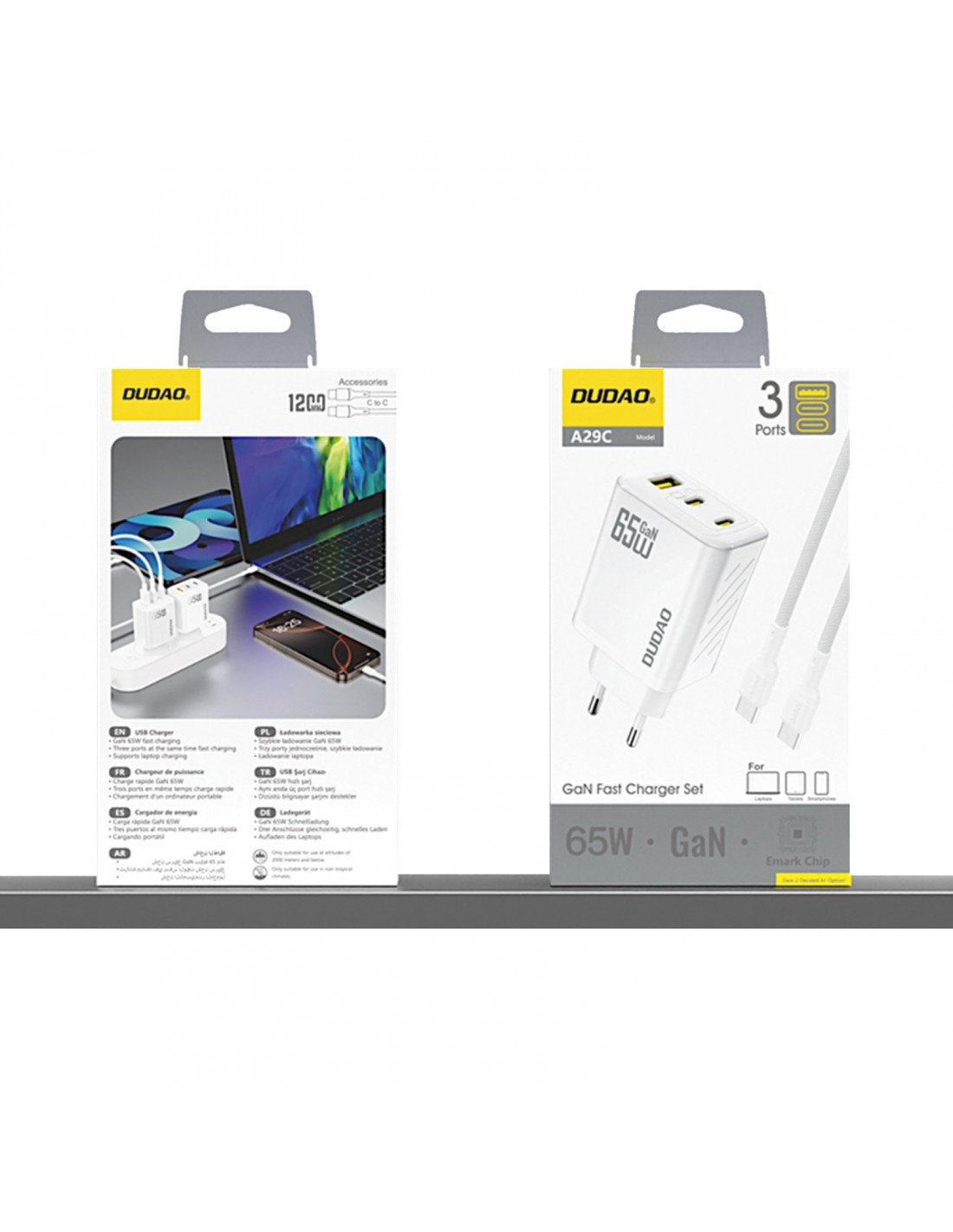 „Dudao A29C“ yra pažangus sieninis įkroviklis su „GaN“ technologija , siūlantis iki 65 W galią ir palaikantis greitąjį PD ir QC įkrovimą. Turėdamas tris prievadus (2x USB-C ir 1x USB-A), jis leidžia vienu metu įkrauti kelis įrenginius – nuo išmaniųjų telefonų ir planšetinių kompiuterių iki nešiojamųjų kompiuterių. Integruotas „eMarker“ lustas užtikrina stabilumą ir saugumą, apsaugodamas prijungtą įrangą. Į komplektą įeina 1 m USB-C–USB-C laidas, palaikantis greitąjį įkrovimą ir duomenų perdavimą. Balta spalva ir kompaktiškas dizainas daro įkroviklį idealiai tinkantį namams, biurui ir kelionėms.