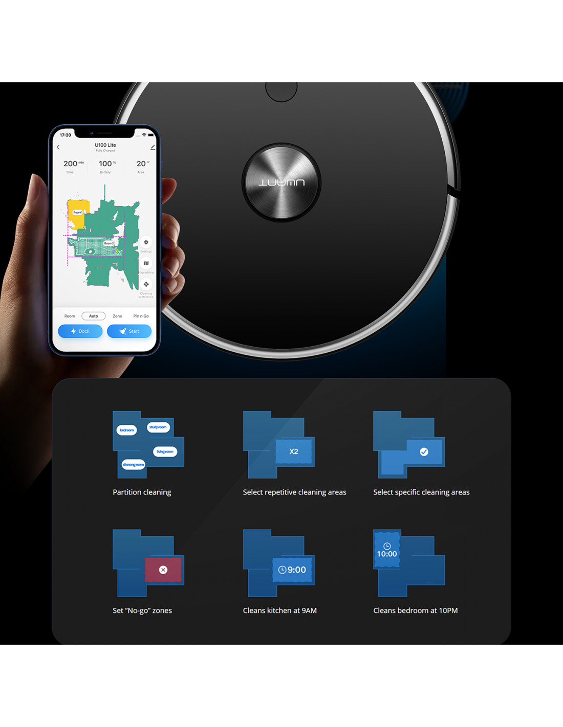- - Automatinis įkrovimas: „U100 Lite“ automatiškai grįžta į įkrovimo stotelę, kai akumuliatoriaus lygis žemas. Tai užtikrina, kad robotas yra paruoštas darbui bet kuriuo metu be jokios priežiūros.