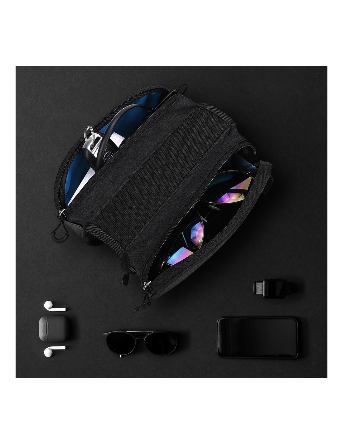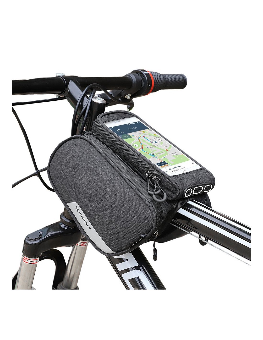 Praktiškas 2 viename prie rėmo tvirtinamas krepšys, kuris taip pat tarnauja kaip patogus daiktadėžė ir telefono dėklas. Savaime suprantama, jis puikiai atlieka abi funkcijas! Dėl didelės talpos (1,5 litro) nereikia aukoti važiavimo komforto dėl kišenėse sugrūstų daiktų. Skaidrus dangtelis su langeliu leidžia naudoti telefoną kelyje kaip navigacijos įrenginį ar muzikos grotuvą – krepšys taip pat turi ausinių prievadą. Visas krepšys pagamintas iš aukštos kokybės, vandeniui atsparių medžiagų, užtikrinančių tiek paties aksesuaro patvarumą, tiek jo turinio saugumą. Lipnios juostelės taip pat užtikrina saugų krepšio pritvirtinimą, nebijojant, kad jis netyčia nuslys nuo dviračio rėmo.