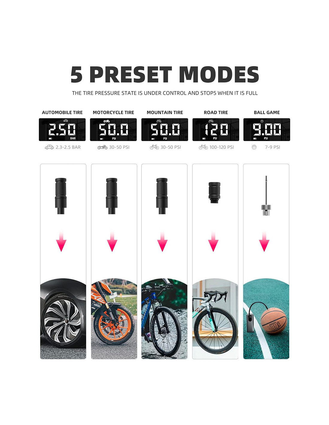 - - Turi 5 skirtingus pripūtimo būdus. Juo galite pripildyti dviratį, motociklą, kamuolį ar net automobilį oru.