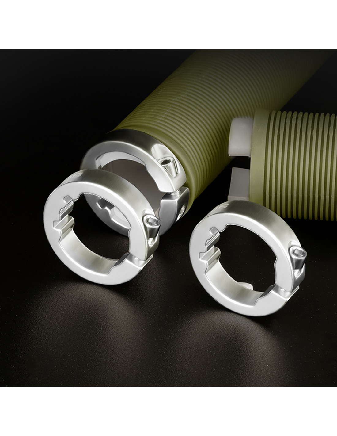 - - Dvipusiai aliuminio fiksavimo žiedai: tvirtai laiko rankenas ant vairo, neleisdami joms suktis važiuojant.