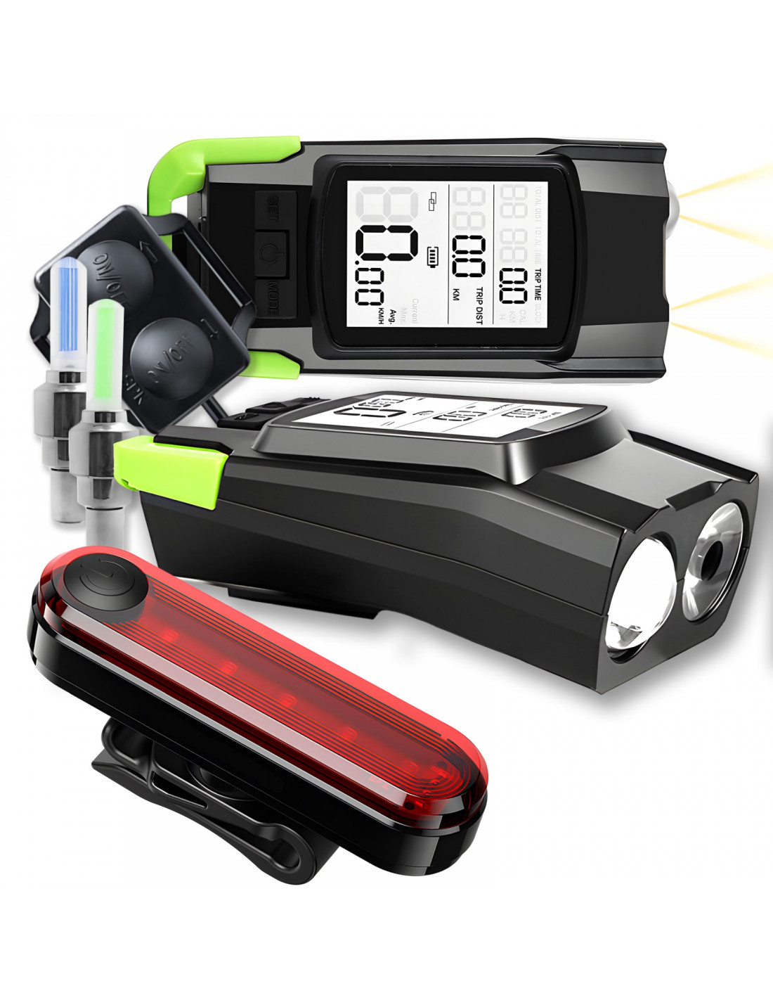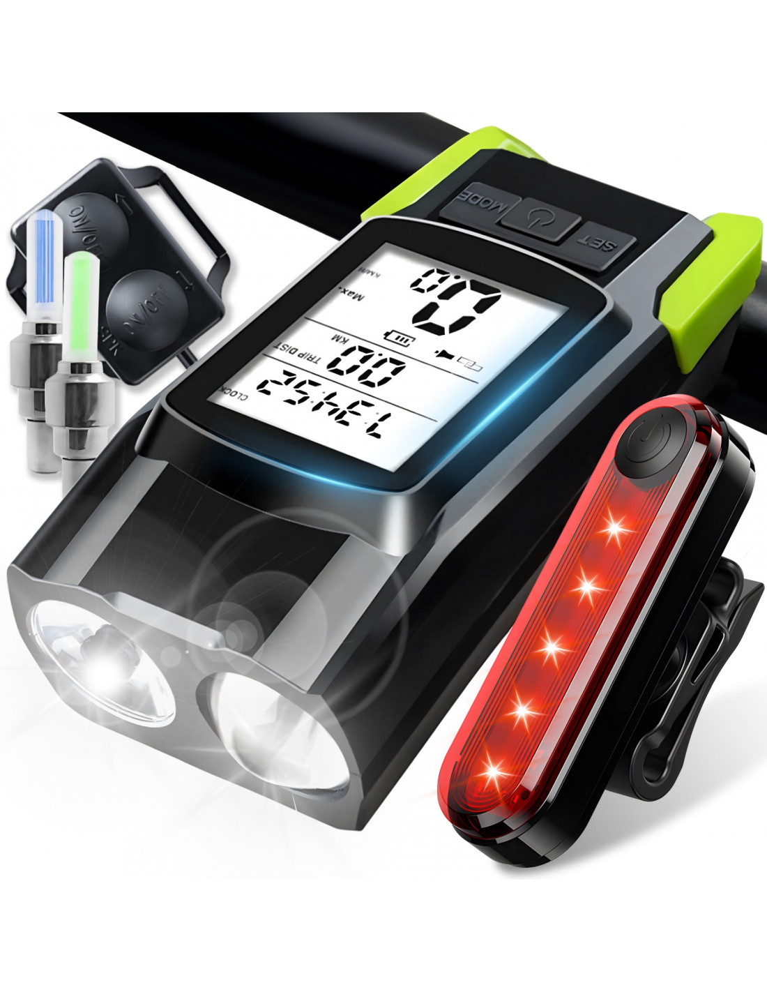 Priekinis ir galinis dviračio žibintas su skaitikliu, skambučiu ir vožtuvais, maitinamas baterijomis