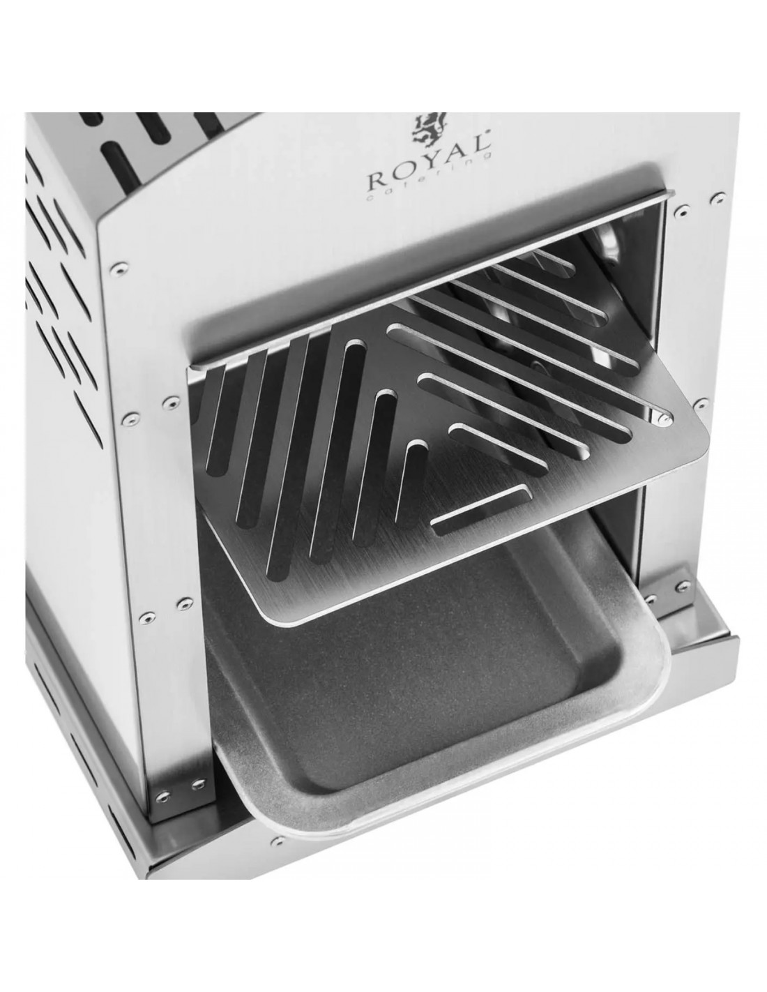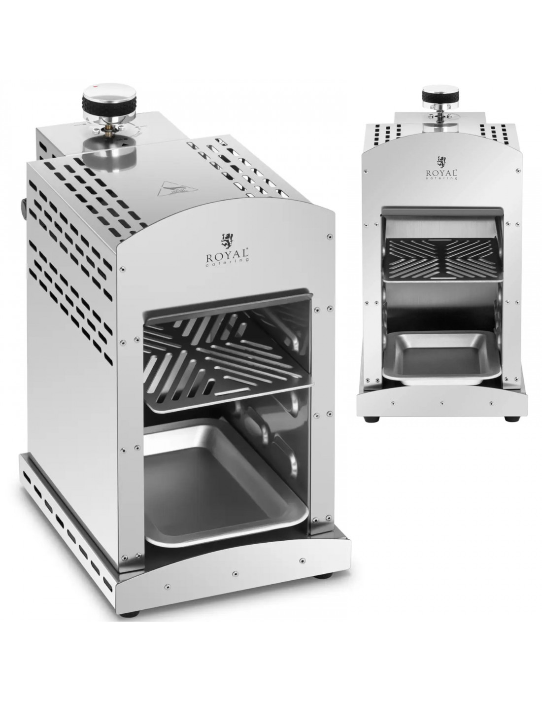 „Royal Catering“ 3500 W dujinė kepsninė vos per 2 minutes pasiekia 800 °C darbinę temperatūrą. Ji paruošia aukščiausios kokybės mėsą: traškią karamelizuota išorėje, minkštą ir sultingą viduje. Skirtingi lygiai leidžia atlikti skirtingą terminį apdorojimą: viršutinė lentynėlė skirta gruzdinimui, apatinė skarda – pašildymui arba švelniam kepimui. Be kepsnių, dujinę kepsninę taip pat galima naudoti žuviai, daržovėms, picai ir desertams ruošti, todėl ji idealiai tinka restoranams, viešbučiams, maitinimo paslaugoms ir maisto vagonėliams, kur svarbiausias greitis, pastovi kokybė ir didelis efektyvumas. Grilio grotelės ir grilio skarda, kurių kiekvienos matmenys yra 25 x 17 cm , yra pakankamai talpios kelioms porcijoms, o nuimama rankena užtikrina saugumą naudojimo metu. Po naudojimo visus plieninius grilio komponentus galima greitai išvalyti, išlaikant higieną net ir intensyviai naudojant. Galimybė prijungti prie propano arba butano leidžia visiškai nešiotis. Paruoškite gardžius kepsnius ir dar daugiau su „Royal Catering“ dujine kepsnine, kuri tikrai pravers daugelyje virtuvių ir vakarėliuose. Norint naudoti grilį, reikalingas slėgio reduktorius , kuris į komplektą neįeina .
