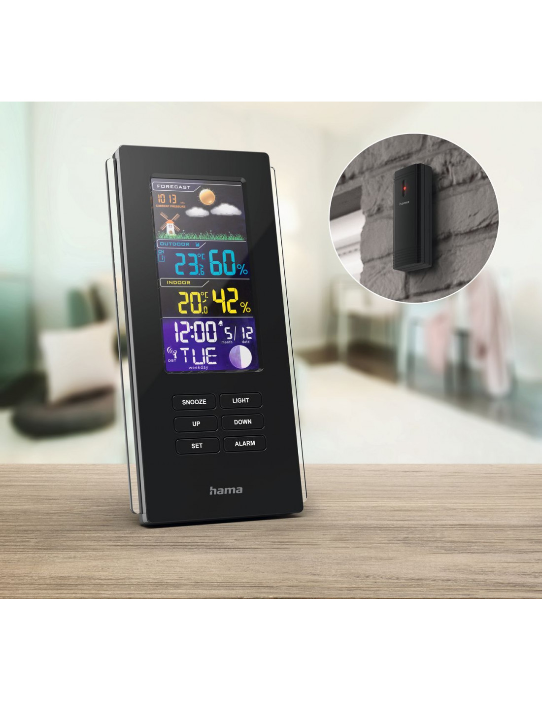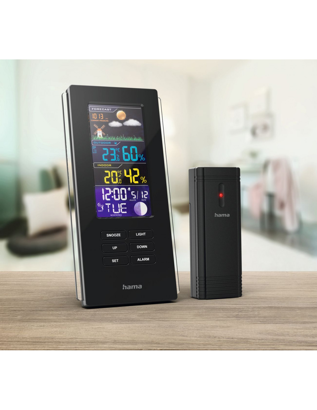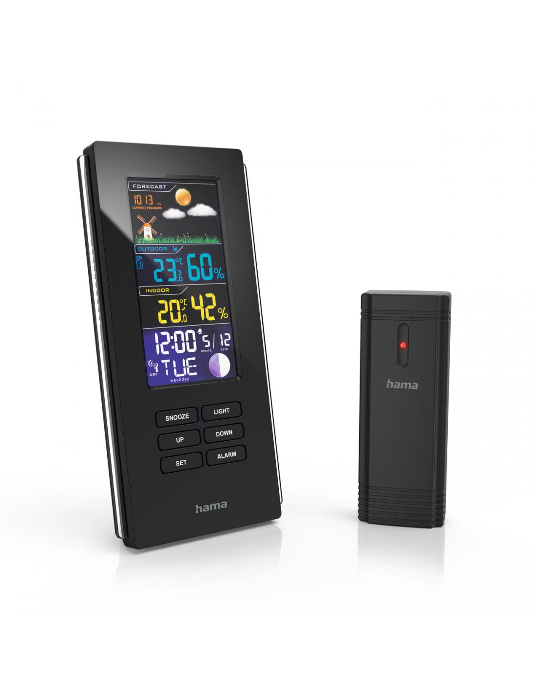 Novatoriška „Hama Color Edge“ meteorologinė stotelė sujungia stilingą dizainą su pažangiomis technologijomis. Puikiai tinka tiems, kurie vertina tikslumą ir patogumą, ji siūlo bet kokio oro prognozes, taip pat informaciją apie drėgmę, temperatūrą ir atmosferos slėgį . Dėl spalvoto ekrano visi duomenys yra aiškūs ir visada po ranka. DCF radijo bangomis valdomas laikrodis garantuoja absoliutų tikslumą, o žadintuvo funkcija su dviem žadintuvo laikais daro šį įrenginį itin praktišką. „Hama Color Edge“ užtikrina komfortą ir kasdienę tvarką.
