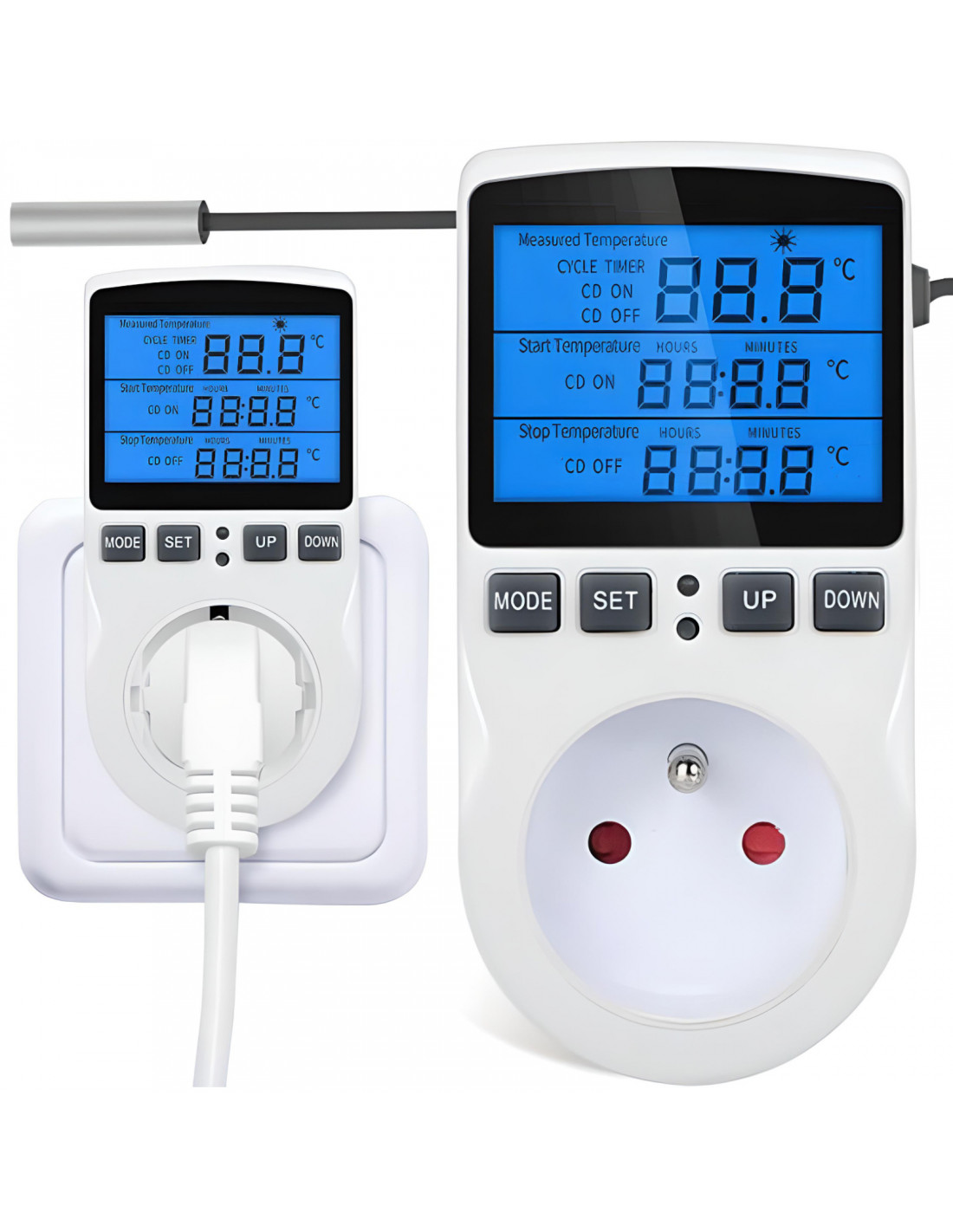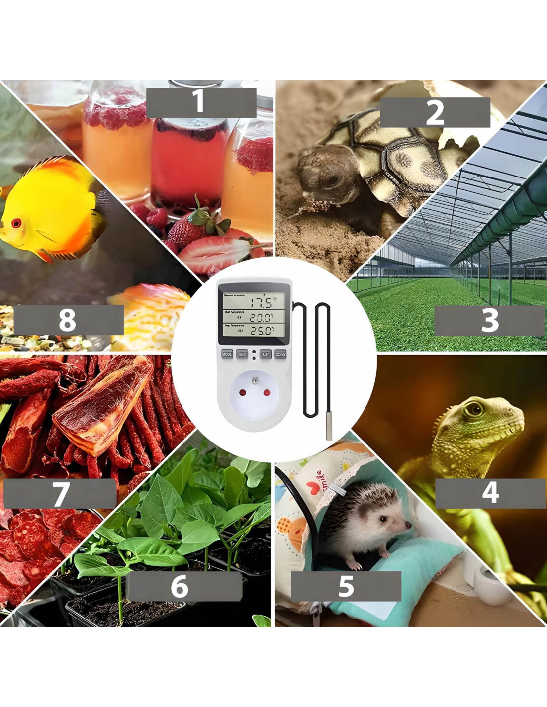 Termostatas yra mažas automatinis temperatūros reguliavimo įtaisas, kuris tiesiogiai jungiamas į elektros lizdą. Įrengtas zondu/jutikliu , jis leidžia valdyti šildymą ir vėsinimą ir turi aiškų, mėlynai apšviestą LED ekraną. Jis tinka naudoti namuose, butuose, šiltnamiuose, dirbtuvėse, biuruose, mokyklose, žemės ūkyje ir terariumuose. Įrenginys užtikrina energijos taupymą, naudotojo komfortą ir paprastą naudojimą.