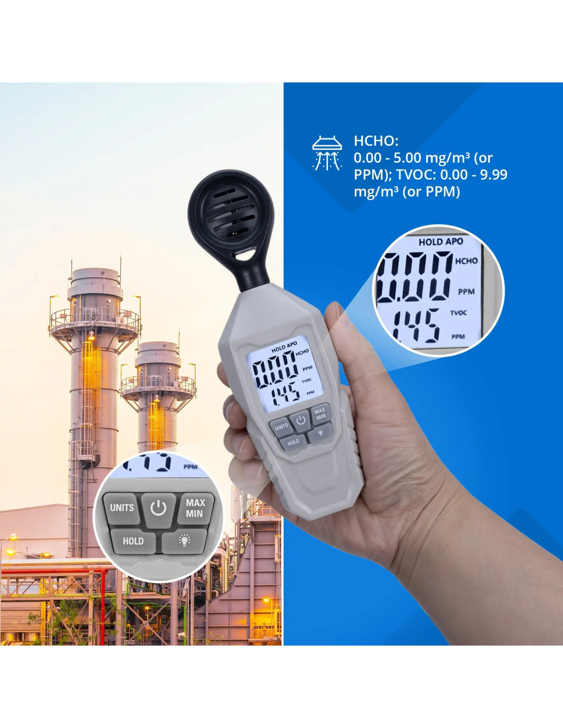 - - Aptikimo diapazonas - HCHO: 0–5 mg/m³ (arba PPM) / TVOC: 0–9,99 mg/m³ (arba PPM)