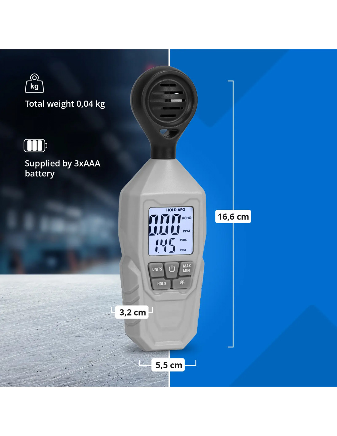 - - Baterijomis maitinamas formaldehido matuoklis su reguliuojamu automatiniu išsijungimu, pagamintas iš patvaraus ABS ir polikarbonato, skirtas naudoti viduje ir lauke.