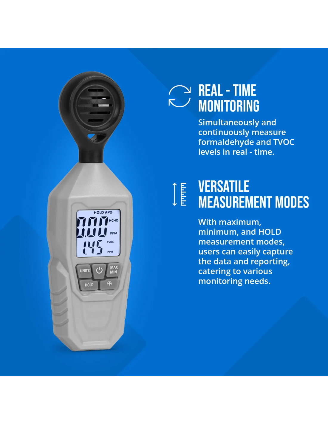 - - Baterijomis maitinamas formaldehido matuoklis su reguliuojamu automatiniu išsijungimu, pagamintas iš patvaraus ABS ir polikarbonato, skirtas naudoti viduje ir lauke.