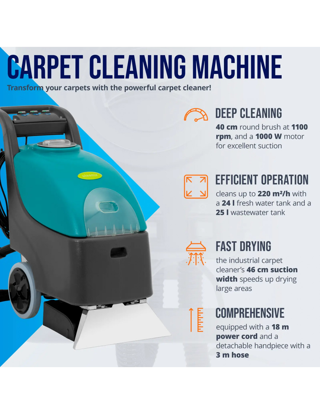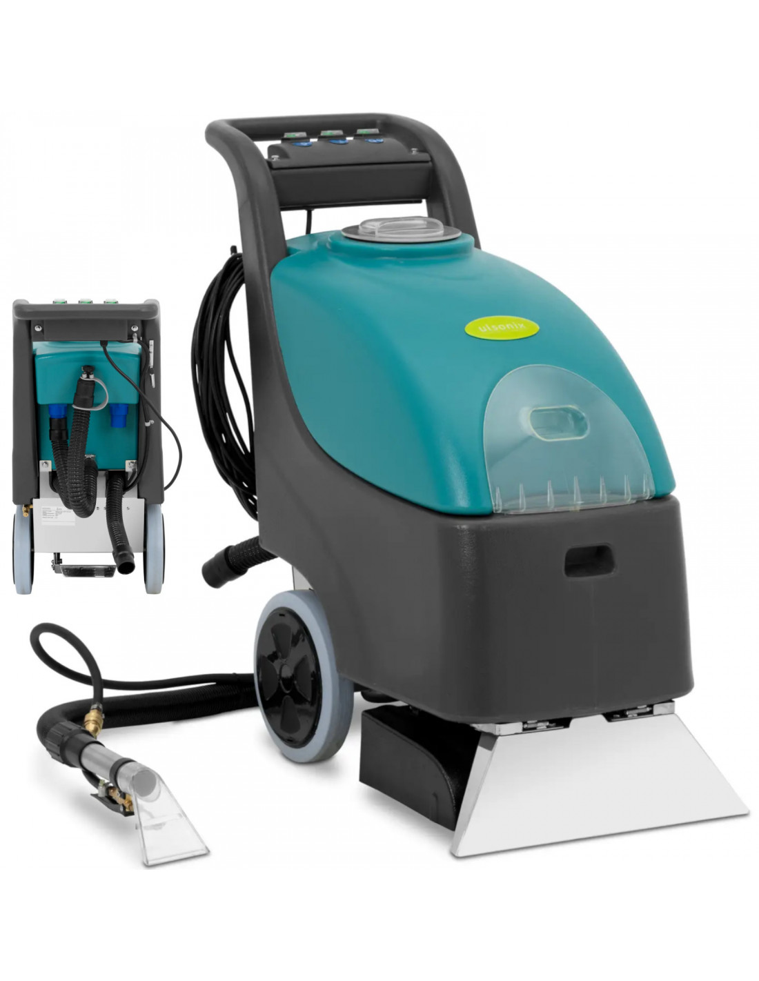 „Ulsonix“ kilimų valymo mašina apjungia novatoriškas technologijas, skirtas visapusiškam valymui. Keturi antgaliai veikia esant 30 psi (2 barų) slėgiui, užtikrindami tolygų vandens paskirstymą. Tuo pačiu metu 40 cm pločio šepetys su 1100 aps./min. greičiu efektyviai pašalina nešvarumus, dėmes ir kvapus iš kilimų. Siurbimo antgalis efektyviai pašalina drėgmę ir pagreitina džiūvimą dėl 1100 W galios, 0,28 baro slėgio ir 46 cm pločio. Tvirtos nerūdijančio plieno galvutės užtikrina ilgaamžiškumą ir patikimą veikimą. Ši pramoninė mašina stebina savo našumu ir 220 m²/val. valymo našumu. Ji tinka didelio masto pritaikymui gyvenamosiose ir komercinėse patalpose. Rankena su 3 m žarna gali būti naudojama sunkiai įveikiamoms dėmėms, kampams ir sunkiai pasiekiamoms vietoms. 24 l švaraus vandens ir 25 l nešvaraus vandens talpos leidžia valyti valandas. 18 m ilgio maitinimo laidas užtikrina maksimalų judesių diapazoną. Paprastas valdymas naudojant matomoje vietoje esantį valdymo bloką leidžia greitai valdyti mašiną po trumpo apmokymo laikotarpio.