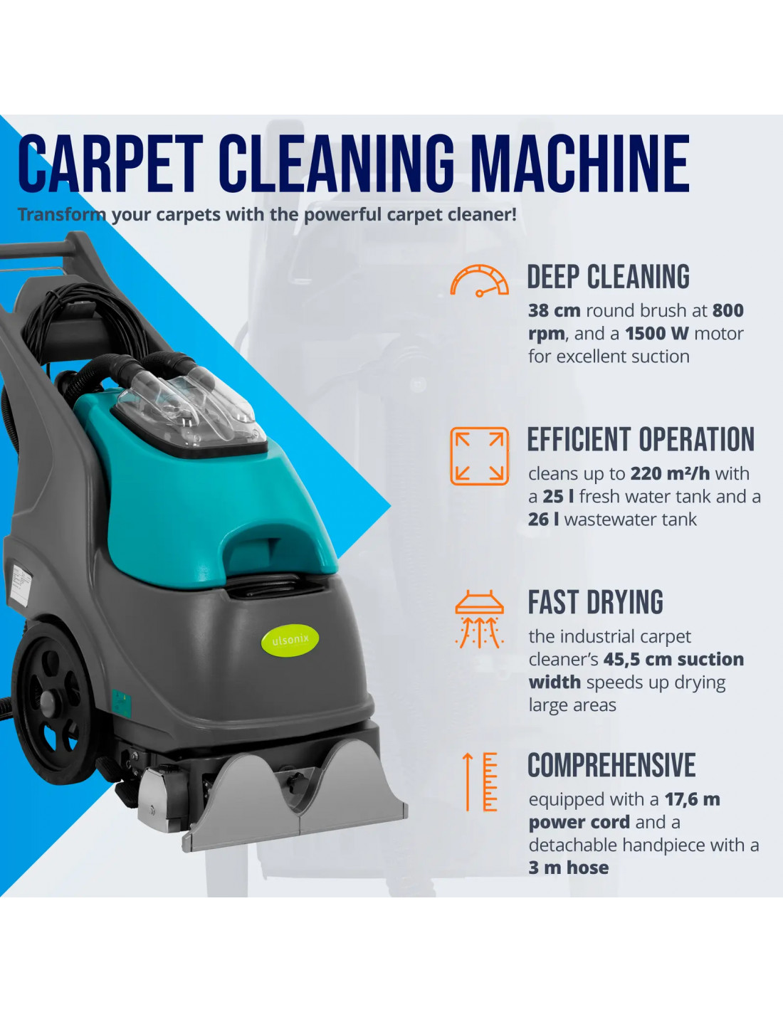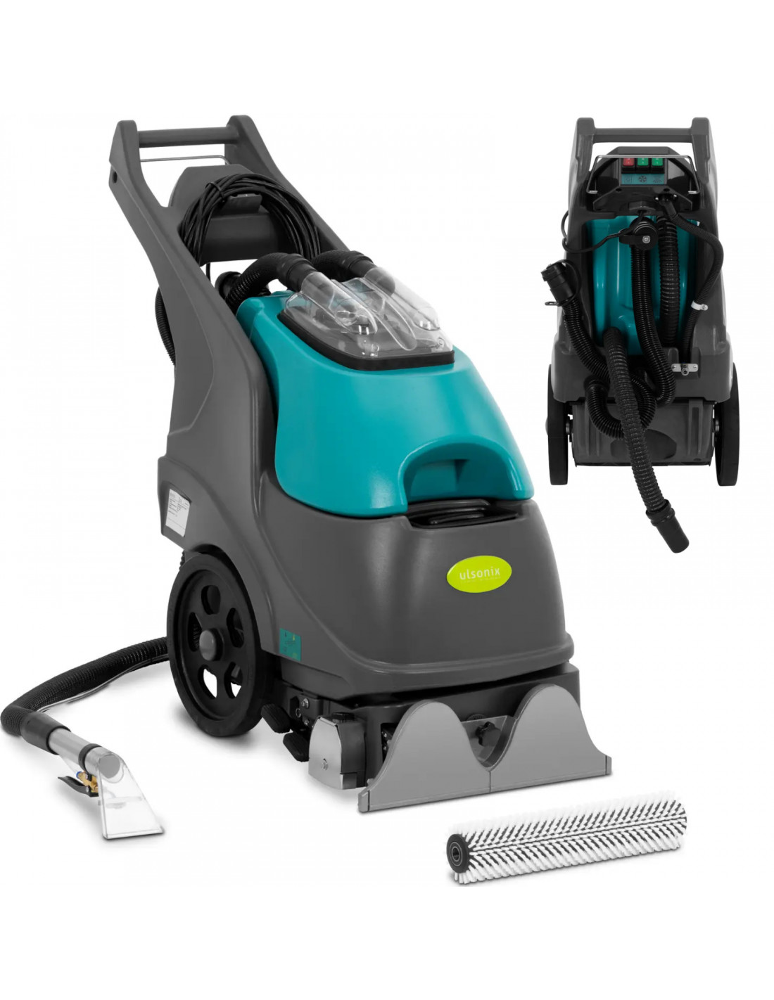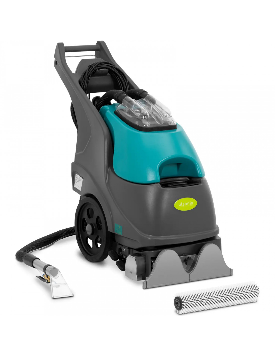 „Ulsonix“ kilimų valymo mašina, kurios bendra galia siekia 1970 W, apjungia novatoriškas technologijas visapusiškam valymui. Keturi antgaliai veikia esant 30 psi (2 barų) slėgiui, užtikrindami tolygų vandens paskirstymą. Tuo pačiu metu 38 cm pločio šepetys, pasiekiantis 800 aps./min., efektyviai pašalina nešvarumus, dėmes ir kvapus iš kilimų. Siurbimo antgalis efektyviai pašalina drėgmę ir pagreitina džiūvimą dėl 1500 W galios, 0,24 baro slėgio ir 45,5 cm pločio. Tvirtos nerūdijančio plieno galvutės užtikrina ilgaamžiškumą ir patikimą veikimą. Ši pramoninė kilimų valymo mašina jus sužavės savo našumu ir 220 m²/val . valymo našumu. Ji idealiai tinka didelio masto pritaikymams gyvenamosiose ir komercinėse patalpose. Įsisenėjusioms dėmėms, kampams ir sunkiai pasiekiamoms vietoms galite naudoti rankeną su 3 m žarna . 25 litrų švaraus vandens ir 26 litrų nešvaraus vandens bakai leidžia valyti valandas. 17,6 metro maitinimo laidas užtikrina maksimalų judesių diapazoną. Paprastas valdymas su gerai matomoje vietoje esančiu valdymo bloku leidžia greitai valdyti įrenginį be jokių papildomų mokymų.