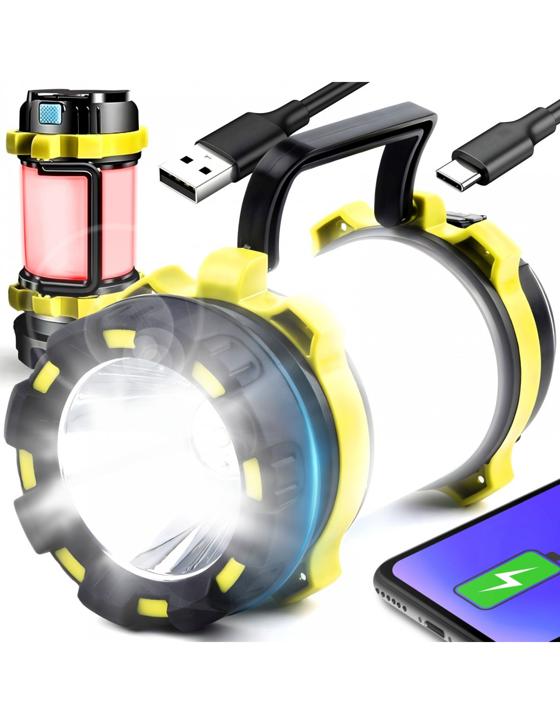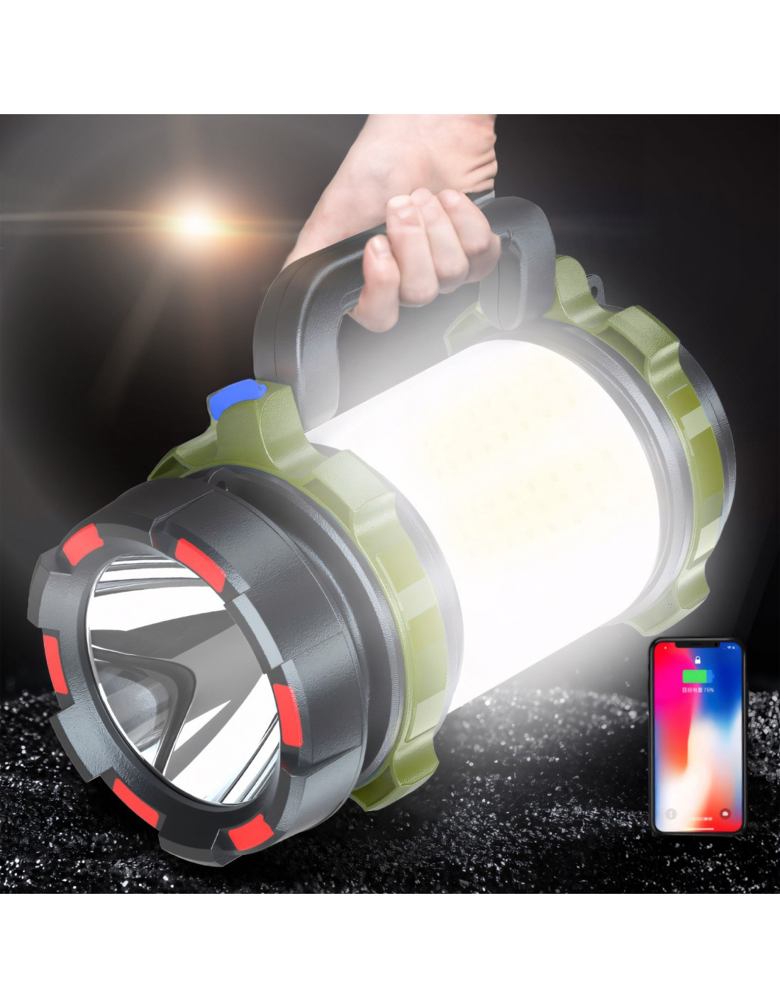 Žygių ir stovyklavimo žibintuvėlis su įmontuota 3000 mAh baterija, įkraunama USB laidu, kurį galima prijungti prie išorinės baterijos, nešiojamojo kompiuterio, automobilinio įkroviklio arba sieninio įkroviklio. Žibintuvėlis taip pat gali būti naudojamas kaip išorinė baterija . Turi 6 apšvietimo režimus , baltą ir raudoną šoninį skydelį bei praktišką rankeną, kad būtų lengva nešiotis ir pakabinti. Idealiai tinka stovyklavimui, kelionėms, automobilio remontui, garažo ir renovacijos darbams bei elektros energijos tiekimo sutrikimų atveju.