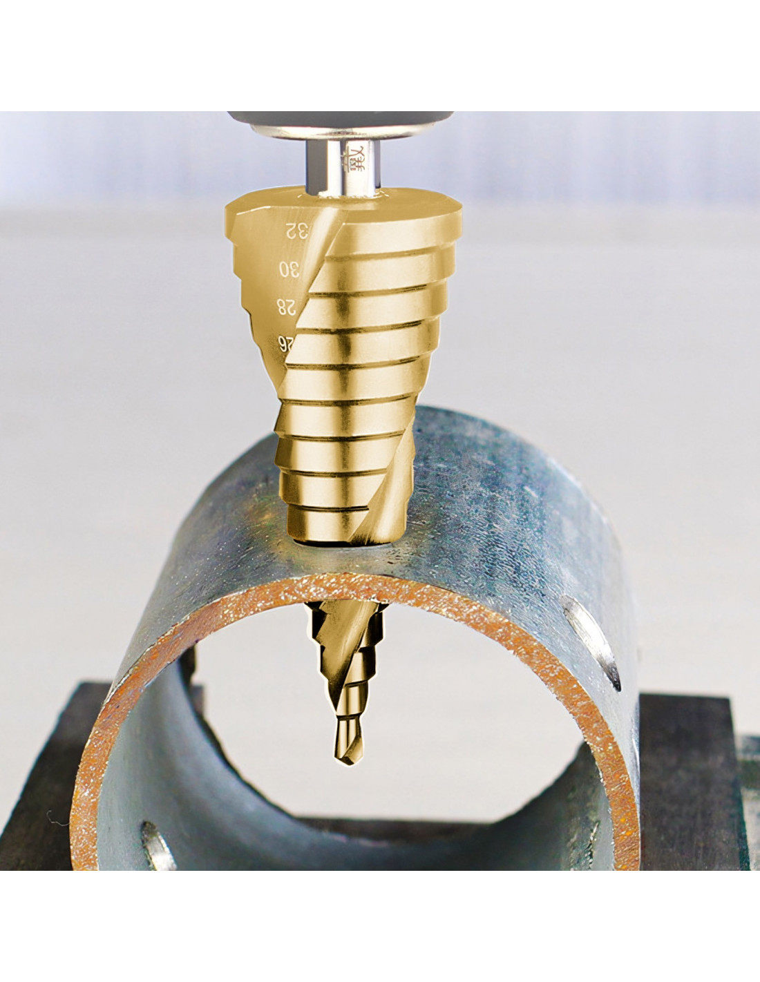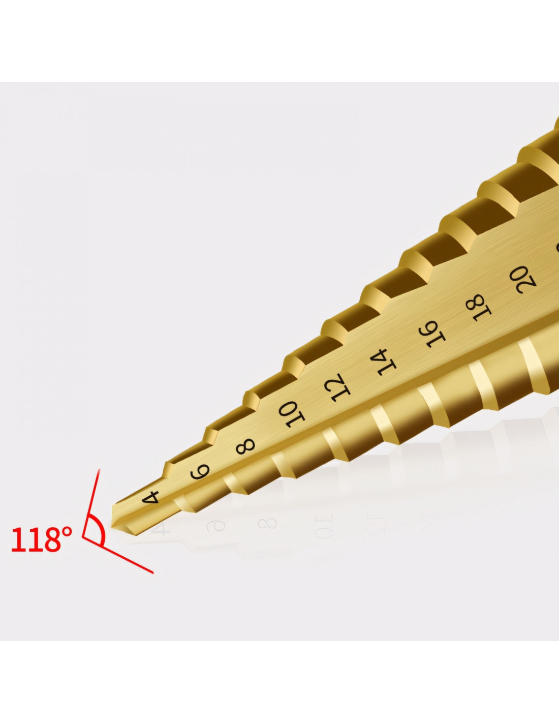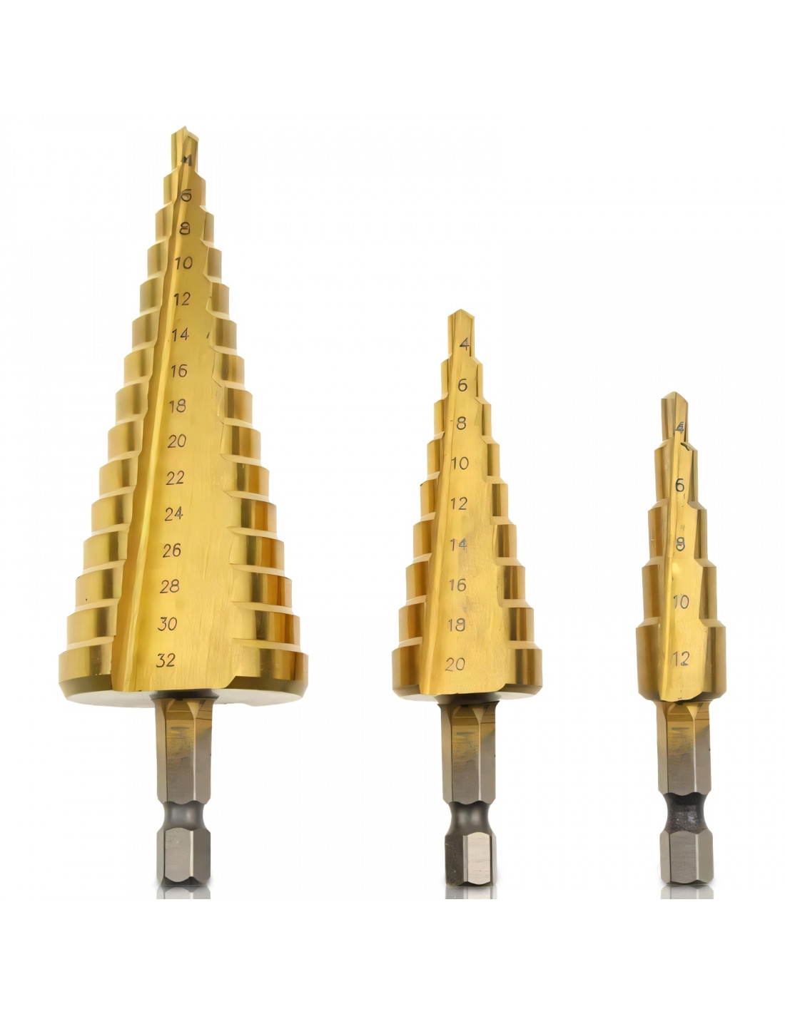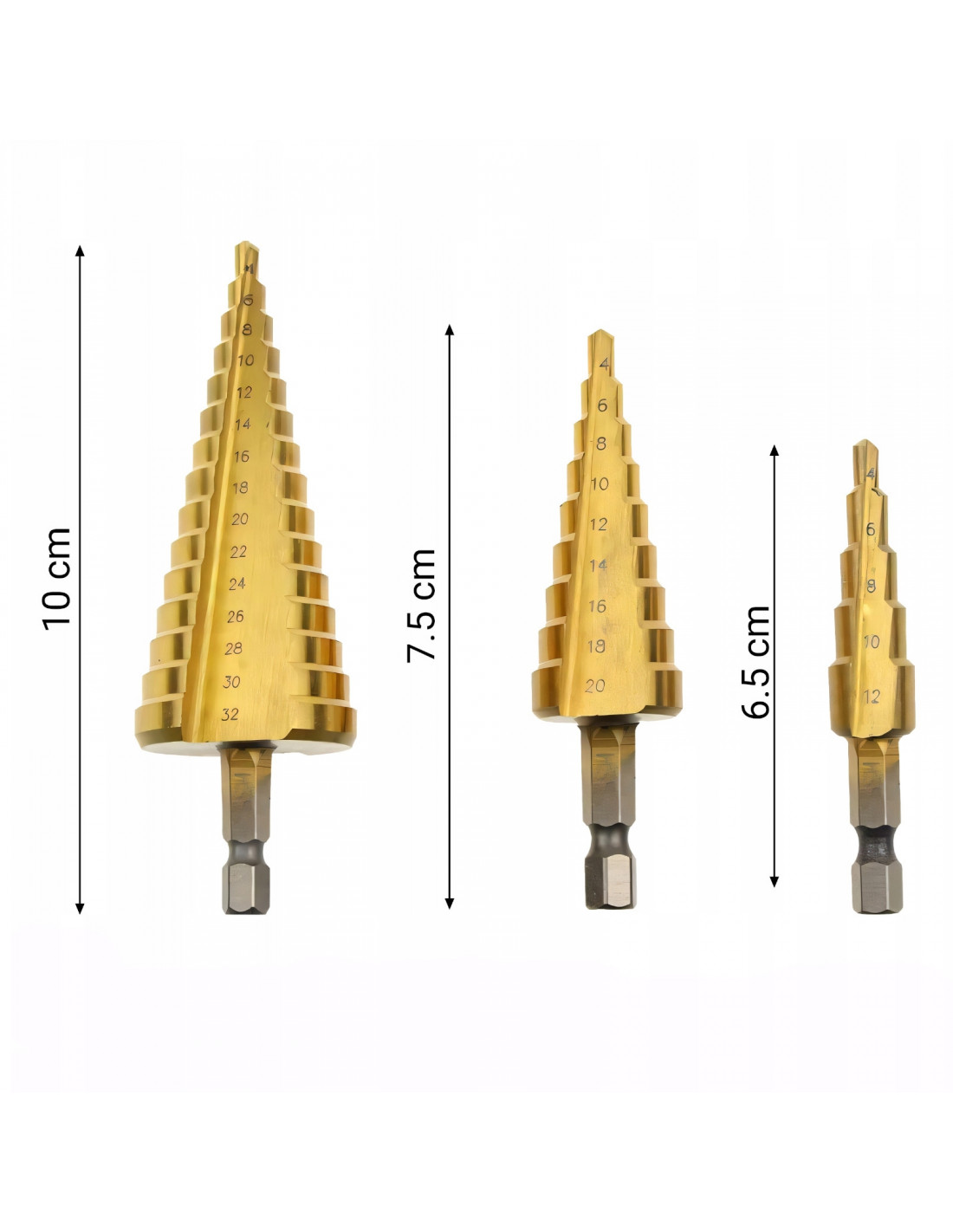 Šie laiptuoti kūginiai grąžtai pagaminti iš aukštos kokybės HSS 6542 greitapjovio plieno, užtikrinančio patvarumą, atsparumą dilimui ir ilgą tarnavimo laiką net ir intensyviai naudojant. Jų konstrukcija leidžia tiksliai ir greitai gręžti įvairias medžiagas, tokias kaip aliuminis, plonas ketaus lakštas, mediena, plastikas, PVC ir subtilūs metalai.