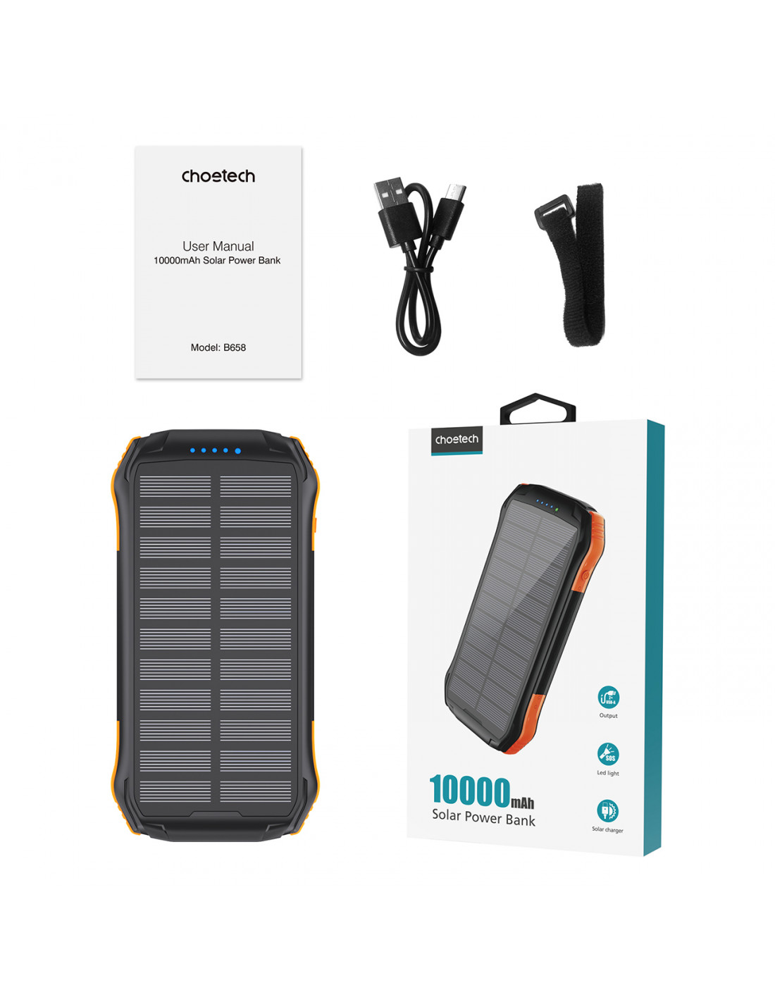 „Choetech B658“ saulės energija varoma išorinė baterija – puikus sprendimas aktyviems ir reikliems vartotojams. Ši juodos ir oranžinės spalvos išorinė baterija ne tik užtikrina patikimą energijos tiekimą dėl didelės talpos 10 000 mAh baterijos, bet ir gali būti įkraunama saulės energija. Dėl dviejų USB-A prievadų galite vienu metu įkrauti du įrenginius, o įmontuotas LED žibintuvėlis su įvairiais apšvietimo režimais pravers bet kokioje situacijoje. „Choetech B658“ išorinė baterija suderinama su įvairiais įrenginiais, įskaitant „iPhone“, „Huawei“ ir „Samsung“.