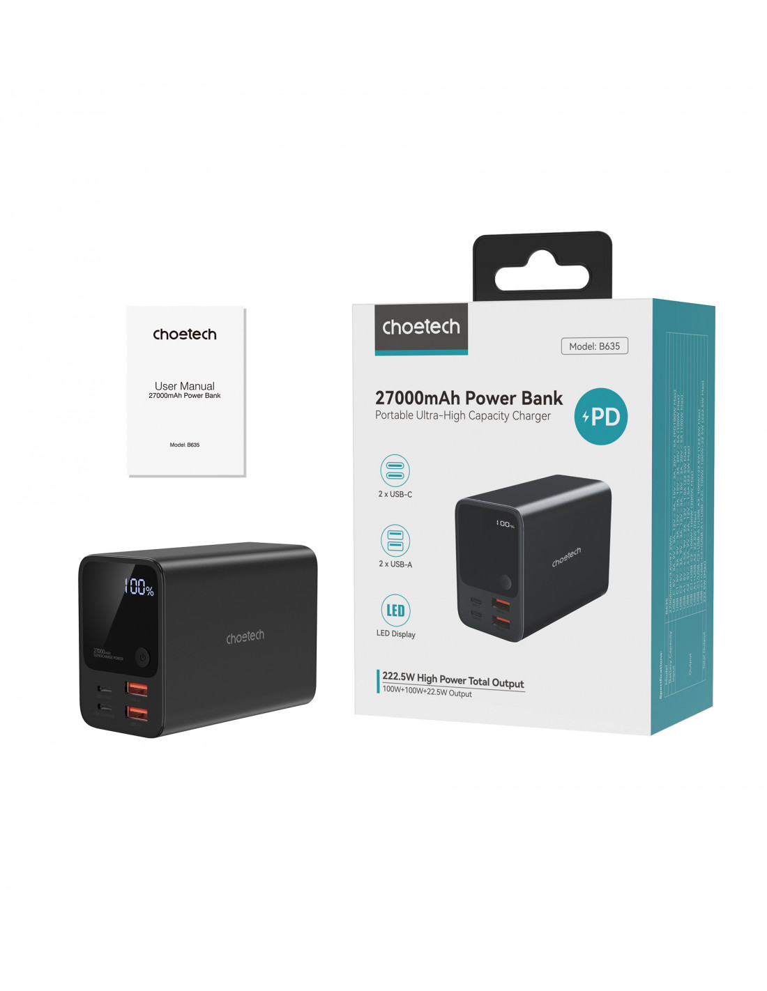 Nešiojamoji baterija 27000 mAh, 2x USB-A, 2x USB-C, 100 W, juoda