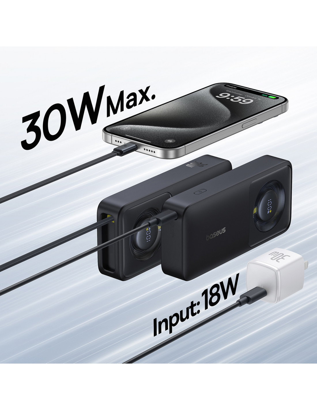 „Baseus Free2Pull“ išorinė baterija siūlo greitą įkrovimą. USB-C laidas ir USB-C prievadas leidžia įkrauti įrenginius iki 30 W galia, o pati išorinė baterija gali būti įkraunama iki 18 W galia. Tai reiškia, kad nesvarbu, ar kraunate telefoną, planšetinį kompiuterį, ar pačią išorinę bateriją, visas procesas yra greitas ir efektyvus.