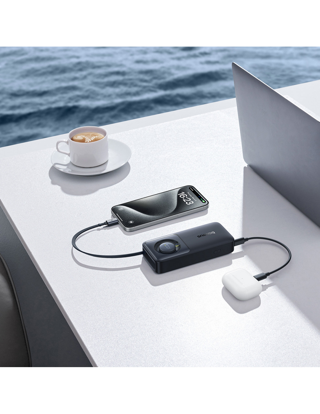 - – Įkrauna du įrenginius vienu metu . Leidžia įkrauti du įrenginius vienu metu dėl integruoto USB-C laido ir USB-C prievado. Idealiai tinka keliautojams ir tiems, kuriems reikia nešiojamojo įkrovimo.
