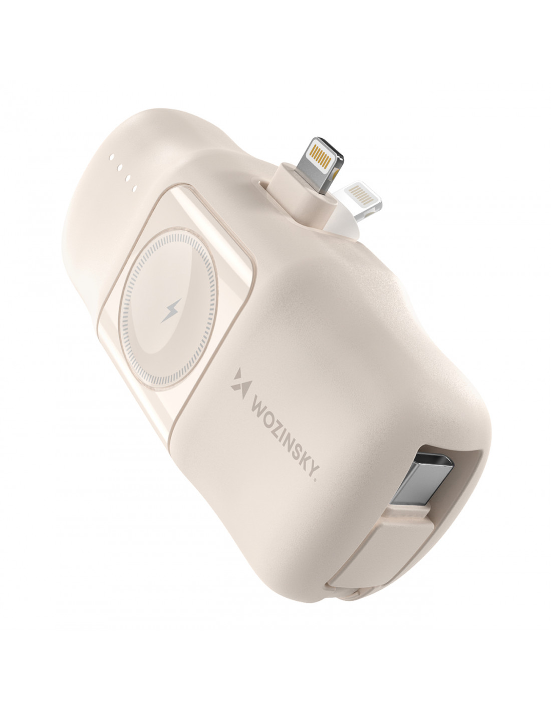 Mini išorinė baterija 5000mAh 15W su „iPhone Lightning“ ir „Apple Watch“ įkrovikliu – smėlio spalvos
