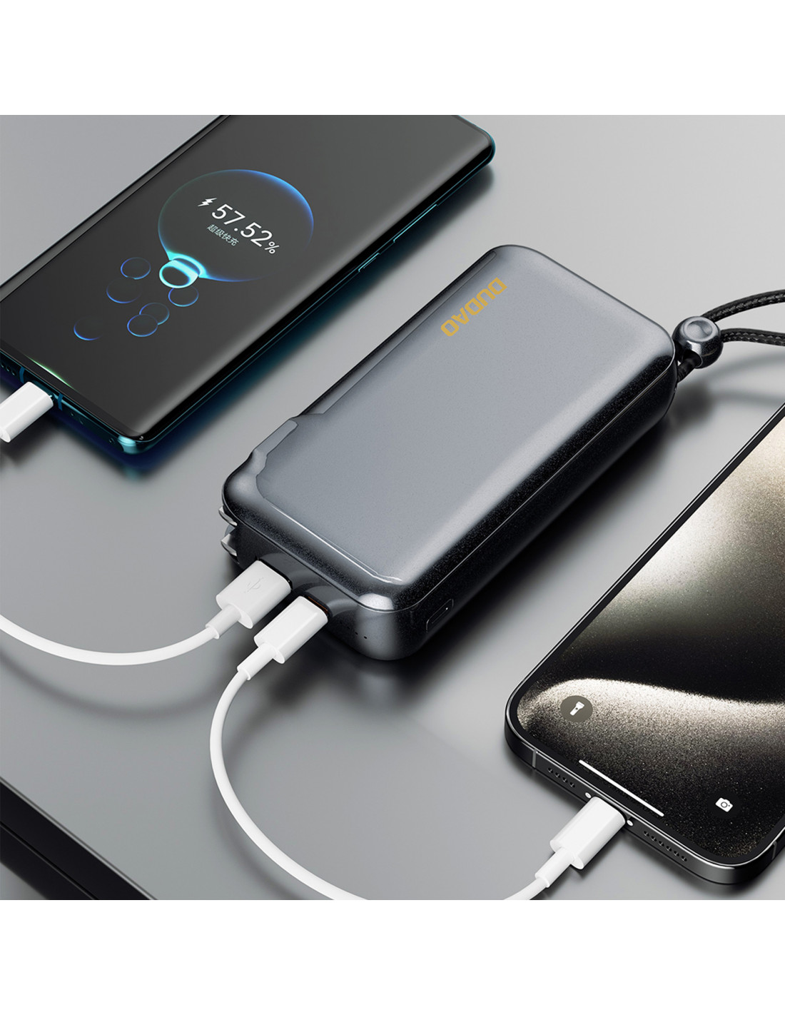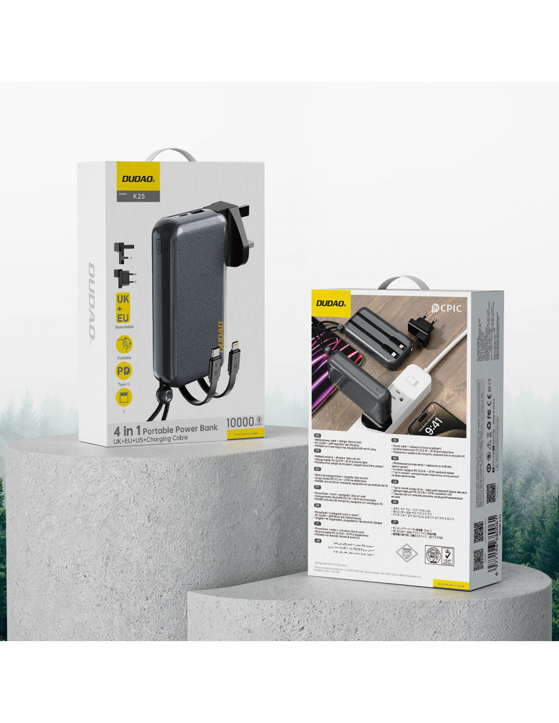 - Integruoti laidai – patogumas ir vietos taupymas: „Dudao K25“ turi integruotus C tipo ir L tipo laidus, todėl nereikia nešiotis papildomų laidų. Išnaudokite visišką mobilumą – niekada nepamirškite laido namuose!