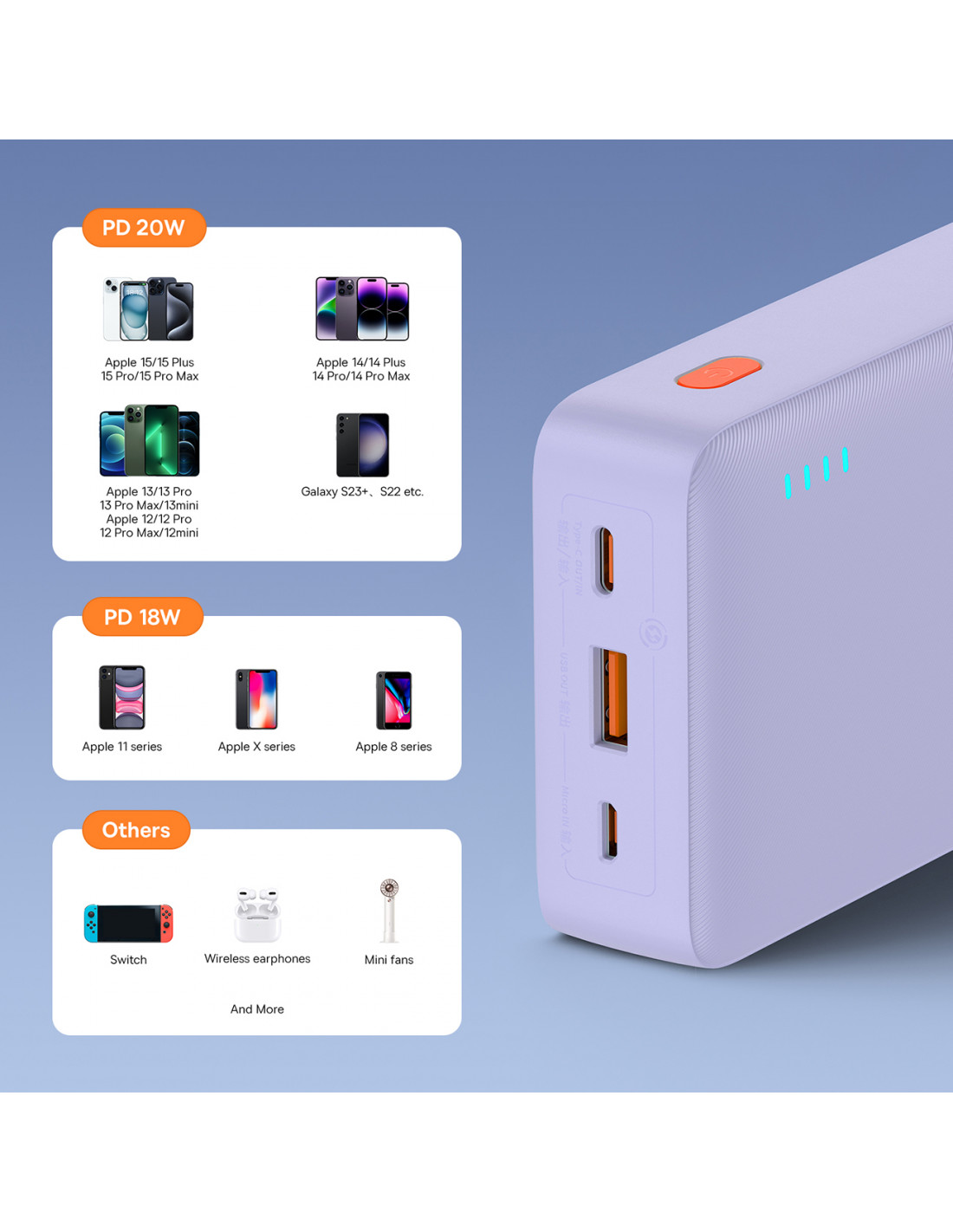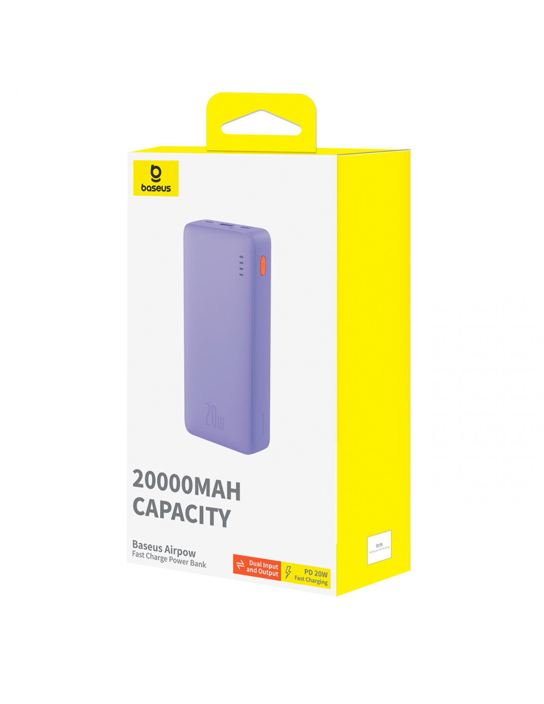 „Baseus Airpow 20W 20000mAh“ išorinė baterija yra puikus sprendimas tiems, kuriems bet kokioje situacijoje reikia patikimo maitinimo šaltinio. Dėl 20 W išėjimo galios ir greito įkrovimo technologijos „Power Delivery“ ji gali greičiau įkrauti įrenginius. Didelė 20000 mAh talpa leidžia kelis kartus įkrauti išmaniuosius telefonus, planšetinius kompiuterius ir kitus įrenginius, o vienu metu įkraunant du įrenginius per USB-C ir USB-A prievadus, sutaupoma laiko. LED indikatorius leidžia patikrinti, kiek energijos liko . Kompaktiškas dydis ir atitikimas oro kelionių reglamentams daro ją puikiu kelionių palydovu. Į komplektą įeina 50 cm ilgio „Baseus Simple Series“ USB-A–USB-C laidas patogiam ir greitam įkrovimui.