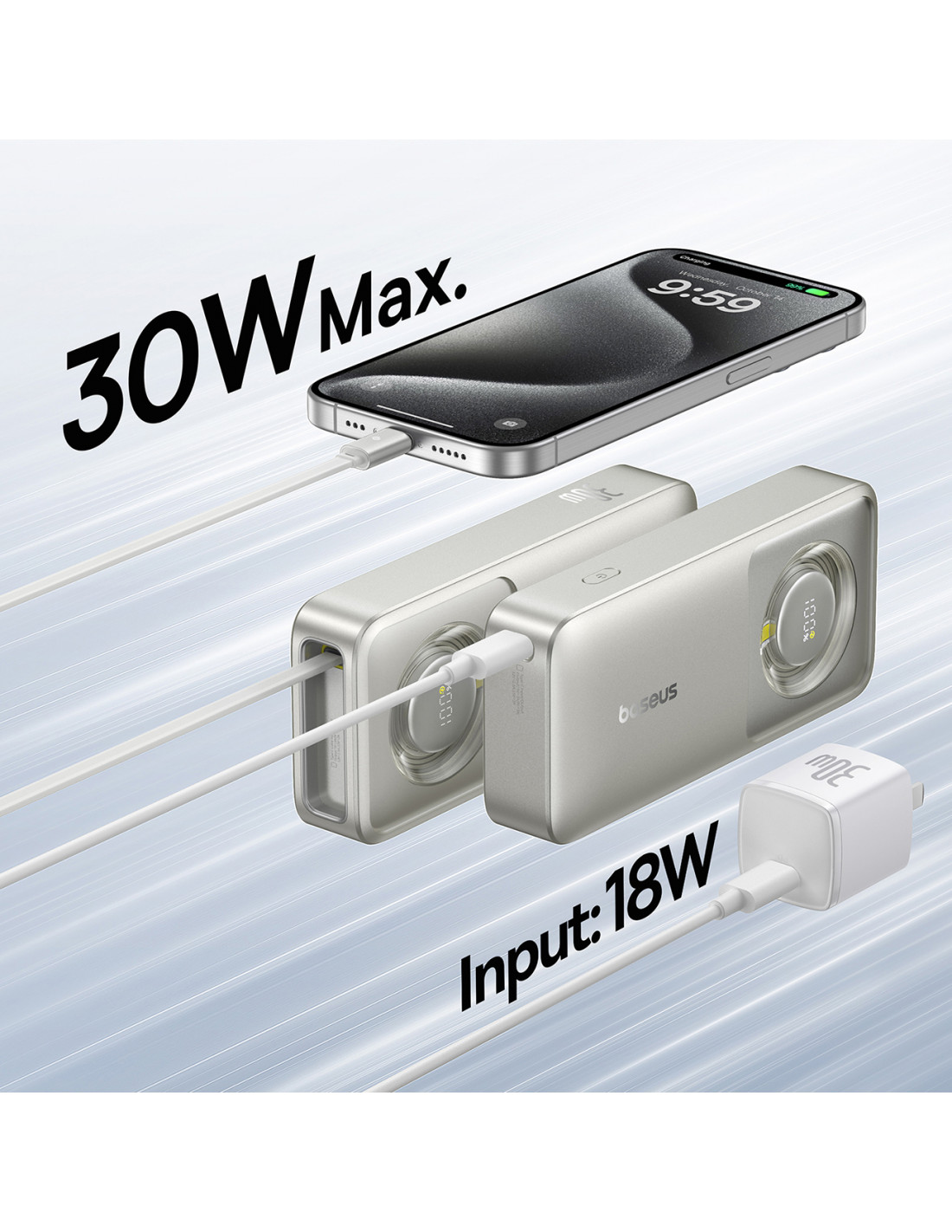 - - Pagreitina įkrovimo procesą . Įvesties / išvesties prievadas ir laidas užtikrina greitą įkrovimą iki 30 W galia.