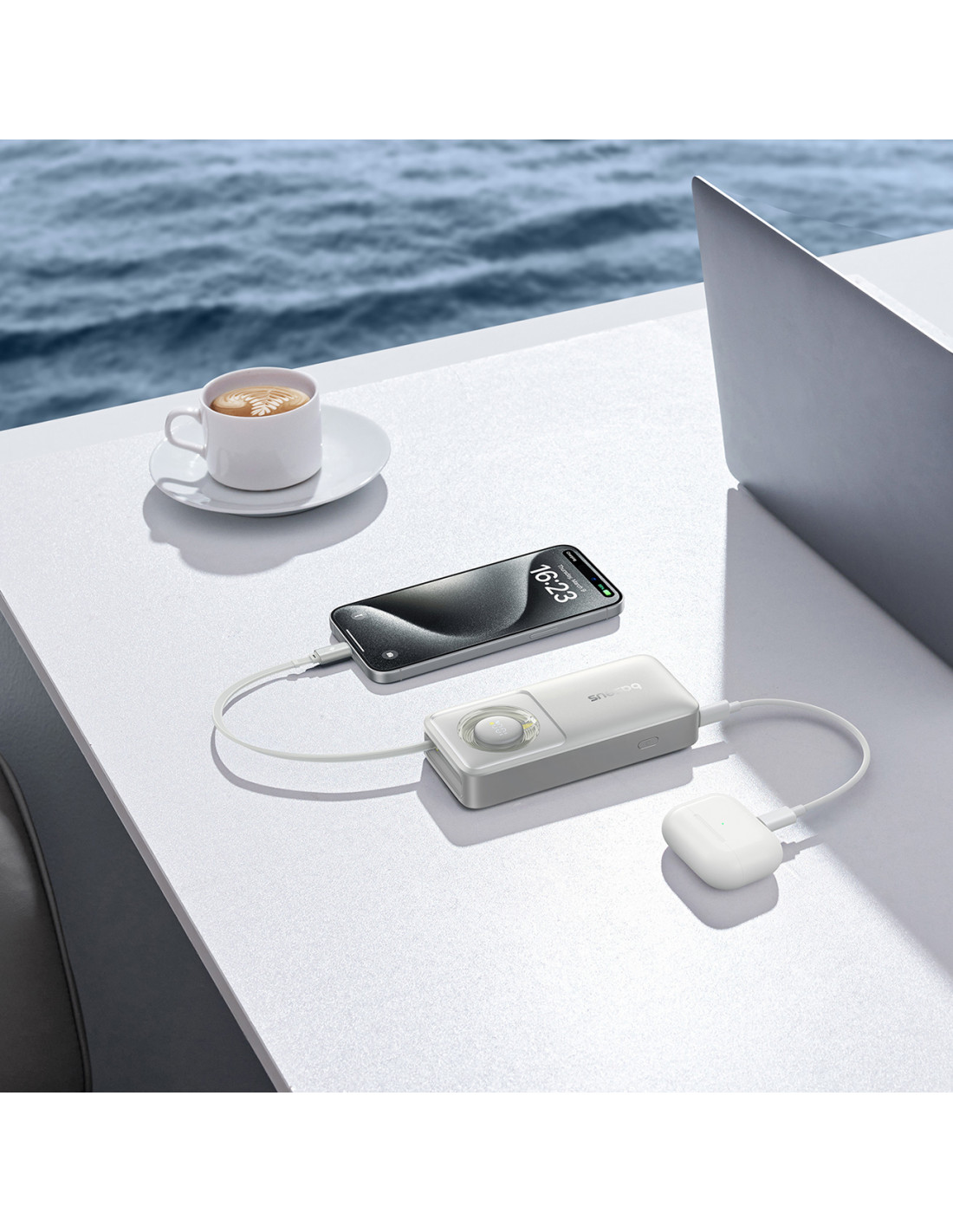 - – Įkrauna du įrenginius vienu metu . Leidžia įkrauti du įrenginius vienu metu dėl integruoto USB-C laido ir USB-C prievado. Idealiai tinka keliautojams ir tiems, kuriems reikia nešiojamojo įkrovimo.
