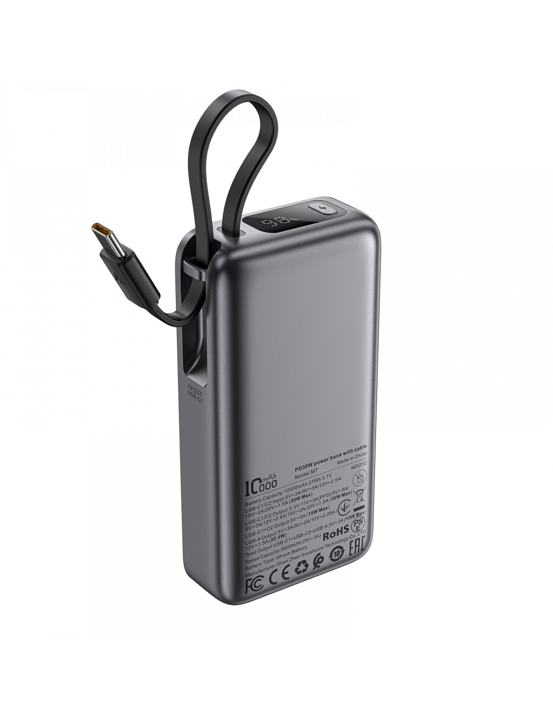 - - 10000mAh PD30W išorinė baterija su integruotu USB-C laidu - juoda
