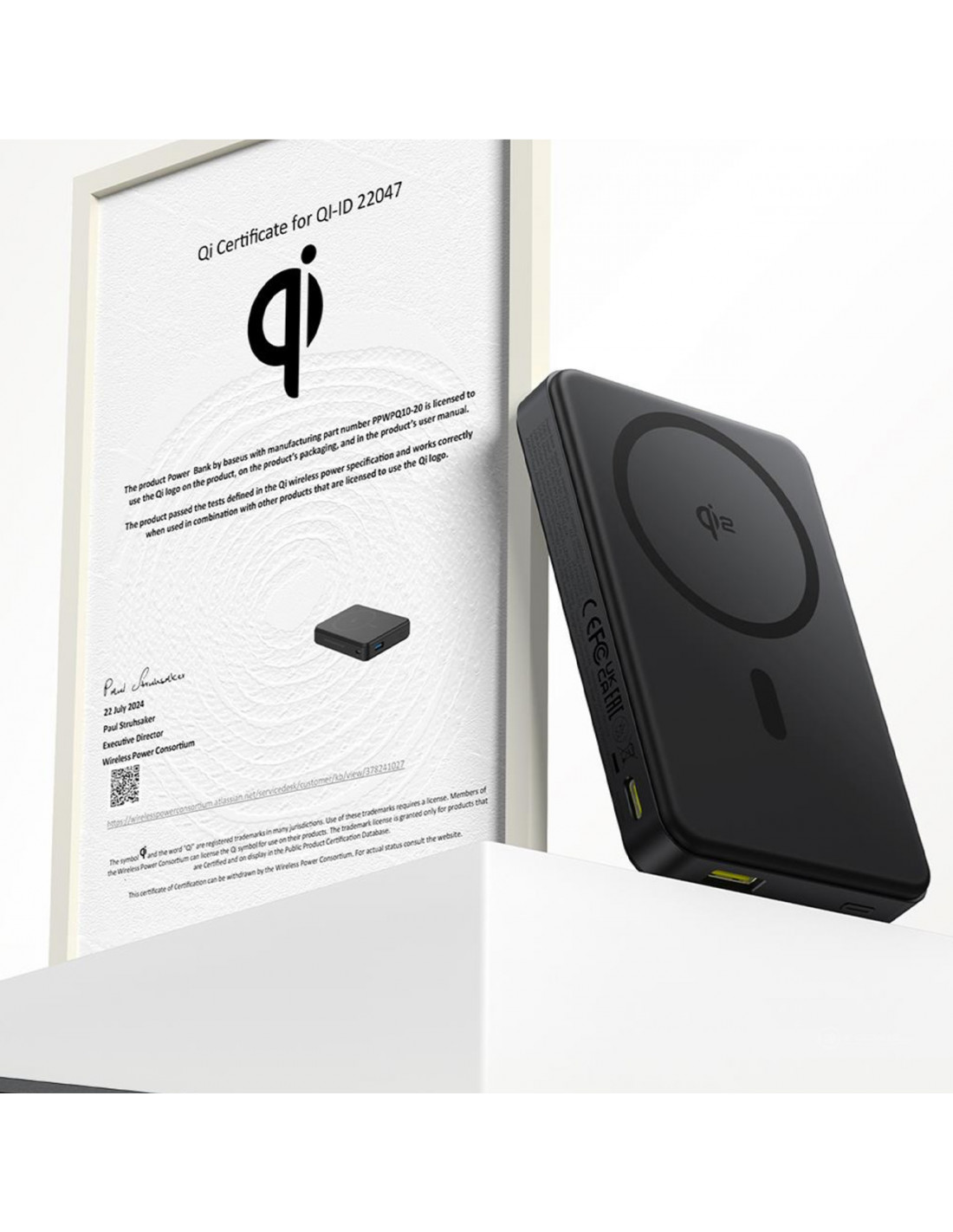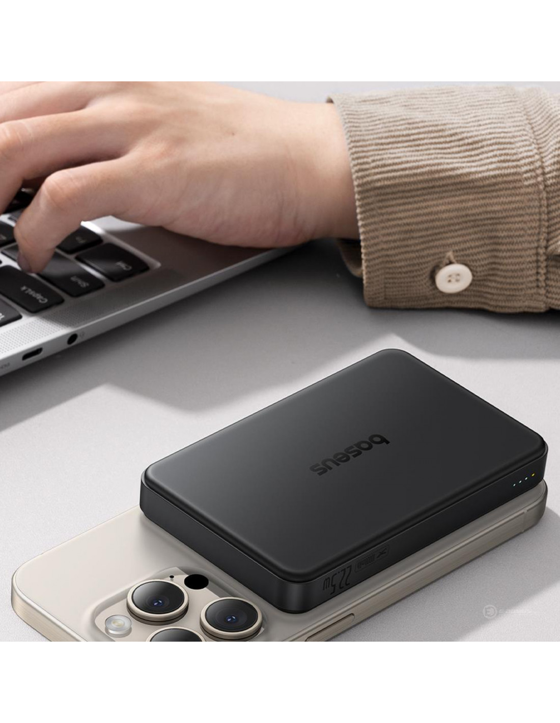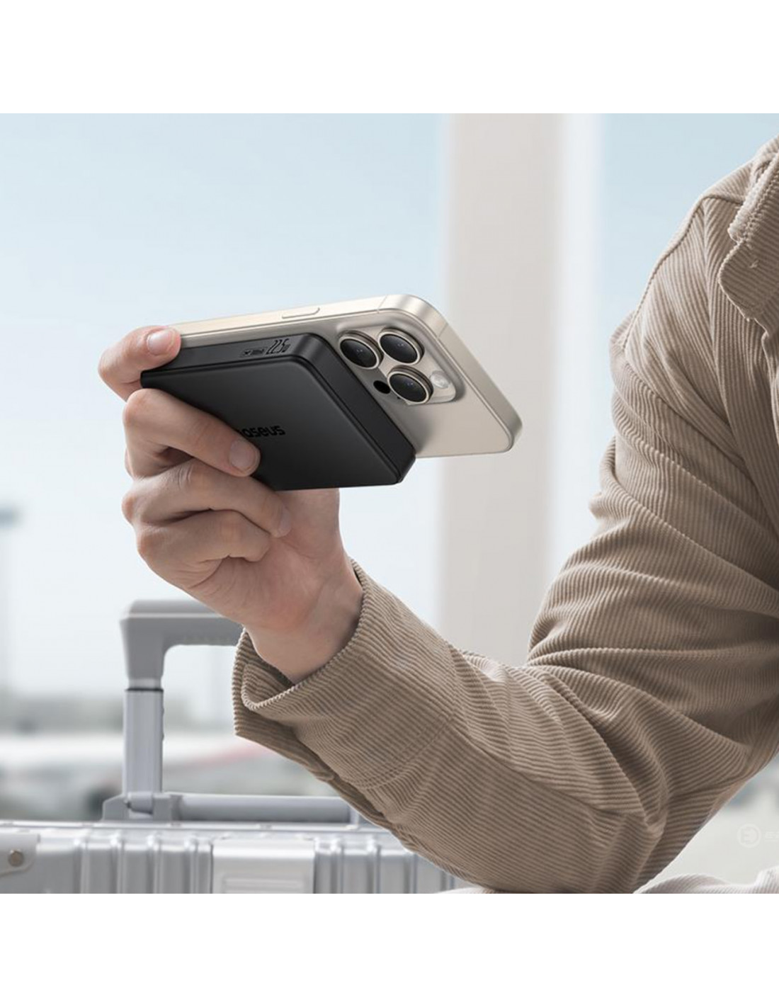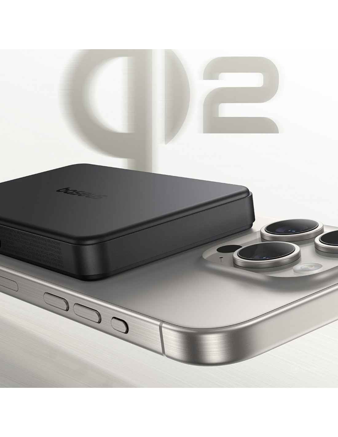 „Baseus Airpow II“ išorinė baterija palaiko „MagSafe“ technologiją, siūlančią greitą 15 W belaidį „Qi2“ suderinamų įrenginių įkrovimą. Magnetinis laikiklis užtikrina stabilų ryšį be atsitiktinių nutrūkimų.