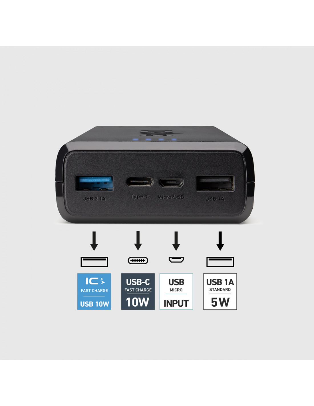 - - Paprastas naudojimas – LED indikatoriai informuoja apie įkrovimo lygį, o komplekte yra USB-A - USB-C laidas.