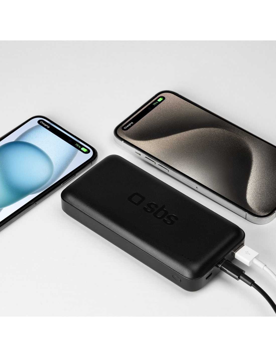 SBS TTBB20000PD20K išorinė baterija turi du išvesties prievadus, leidžiančius vienu metu įkrauti du įrenginius. Dabar galite vienu metu maitinti savo išmanųjį telefoną ir planšetinį kompiuterį, taupydami laiką ir užtikrindami visišką mobilumą.