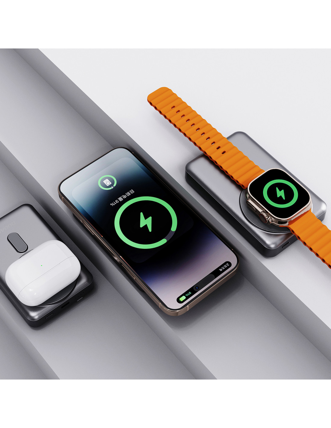 Išorinė baterija K29 10000mAh MagSafe metalinis dėklas, stovas, laidai, USB-C, iPhone Lightning, PD 20W - pilka