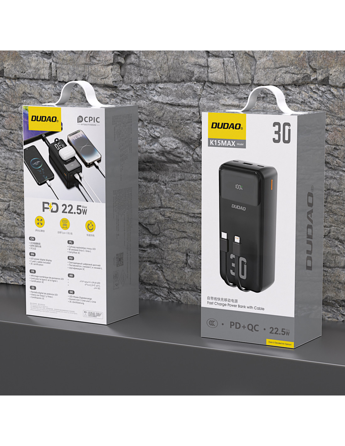 „Dudao K15MAX“ išorinė baterija yra puikus sprendimas visiems, kuriems bet kokioje situacijoje reikia galingo ir patikimo energijos šaltinio. Įspūdinga 30 000 mAh talpa leidžia daug kartų įkrauti išmanųjį telefoną neieškojant maitinimo lizdo. Įrenginys siūlo 22,5 W greitąjį įkrovimą ir palaiko PD bei QC technologijas, todėl yra neįtikėtinai universalus. Integruoti USB-C ir „Lightning“ laidai panaikina poreikį nešiotis papildomų laidų. Penki skirtingi išėjimai leidžia įkrauti kelis įrenginius vienu metu. Tvirta konstrukcija ir minimalistinis dizainas užbaigia komplektą, todėl „Dudao K15MAX“ yra puikus kompanionas kelionėms ir kasdieniam naudojimui.